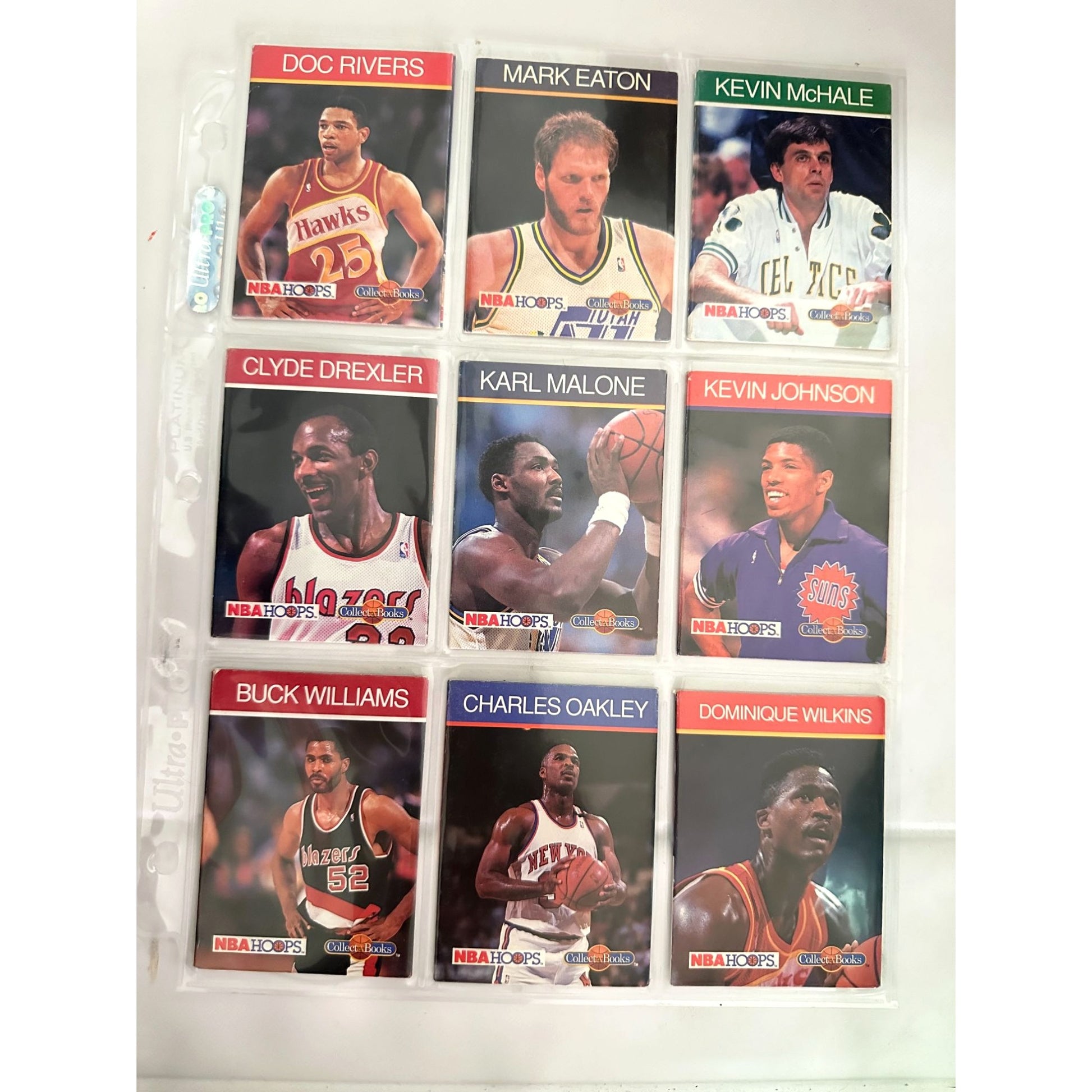 NBA Hoops basketball cards from the 1989-90 series, featuring notable players such as Karl Malone, Reggie Miller, and Dominique Wilkins.