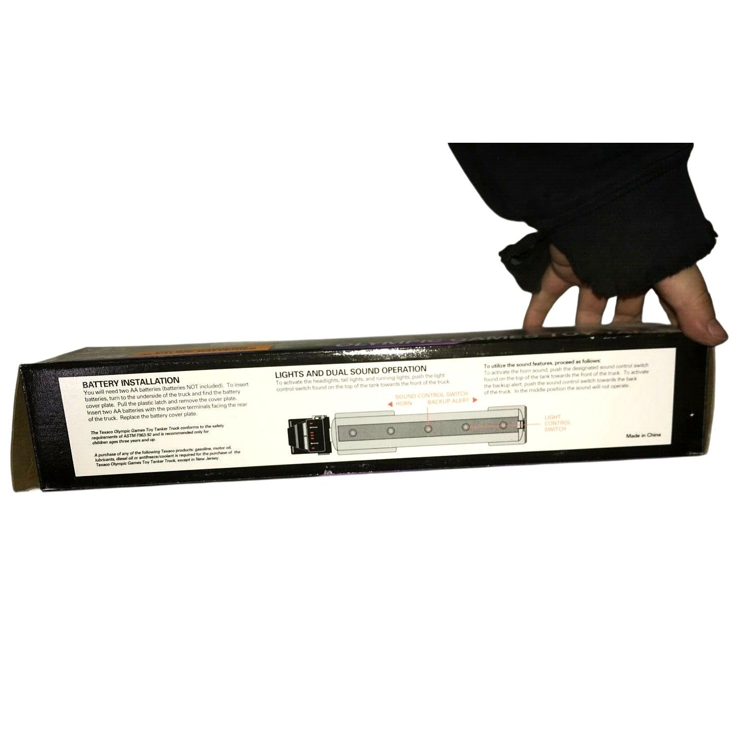 The toy features working headlights, taillights, running lights, and horn/back-up alert sounds.