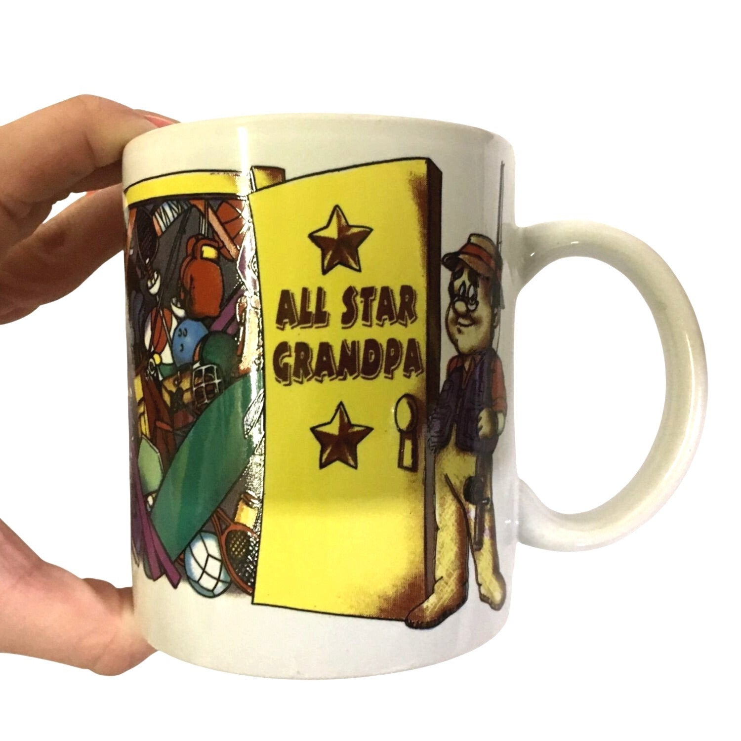 'ALL STAR GRANDPA' Coffee Mug for your favorite Grandpa. Grandpa gift. Grandpa holding fishing pole standing next to a yellow door that's open and a (maybe) closet that's full of sports and other activities equipment. "All Star Grandpa" with 2 stars on door like it's a dressing room. Cute design.