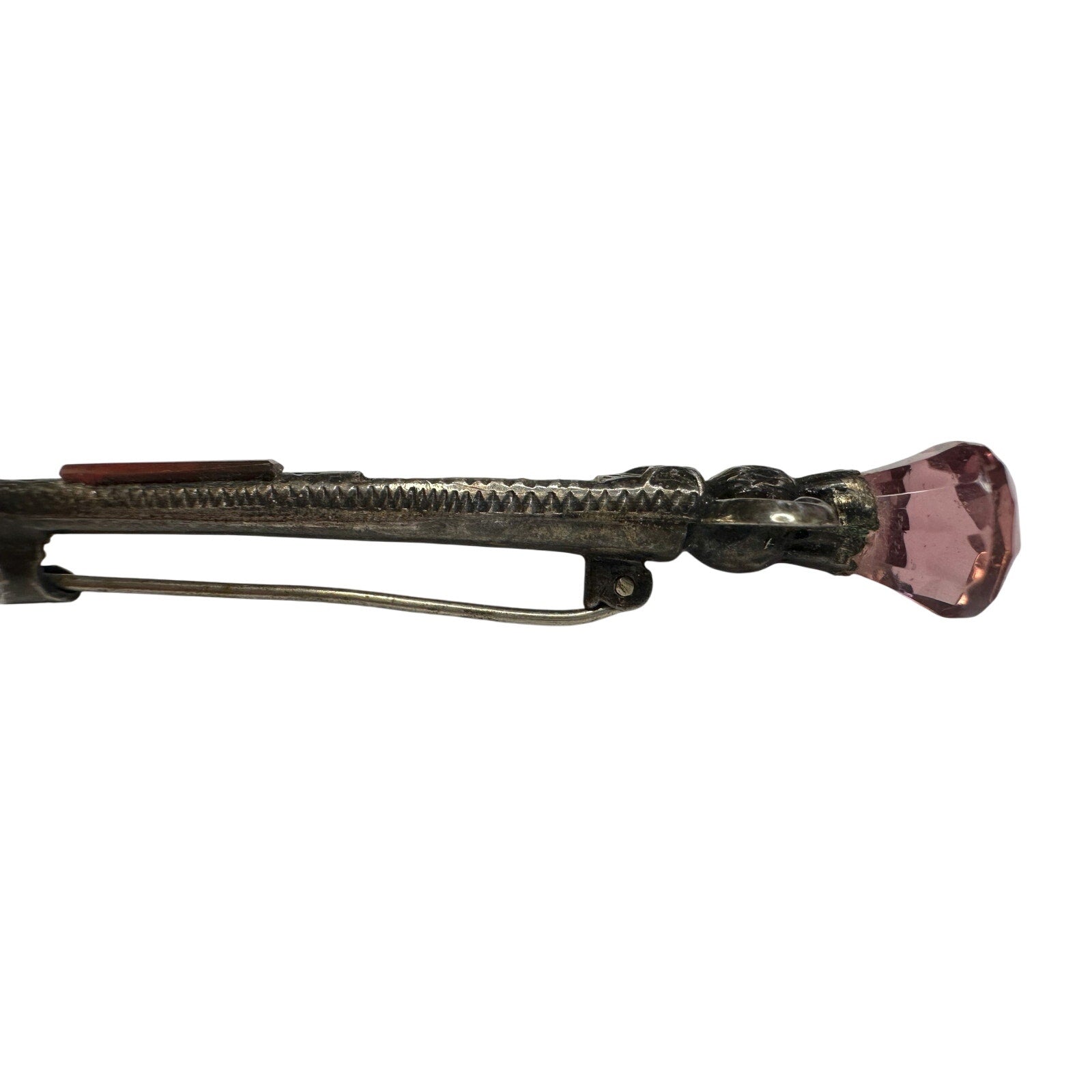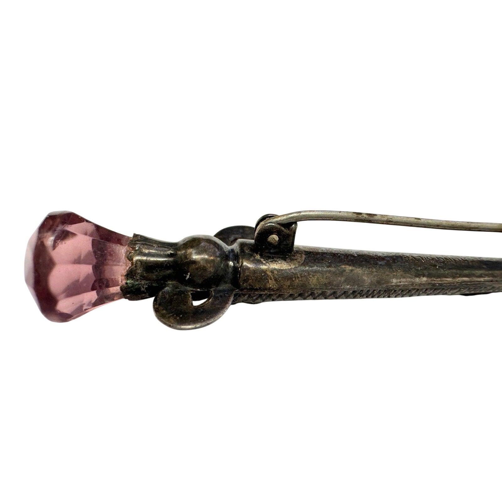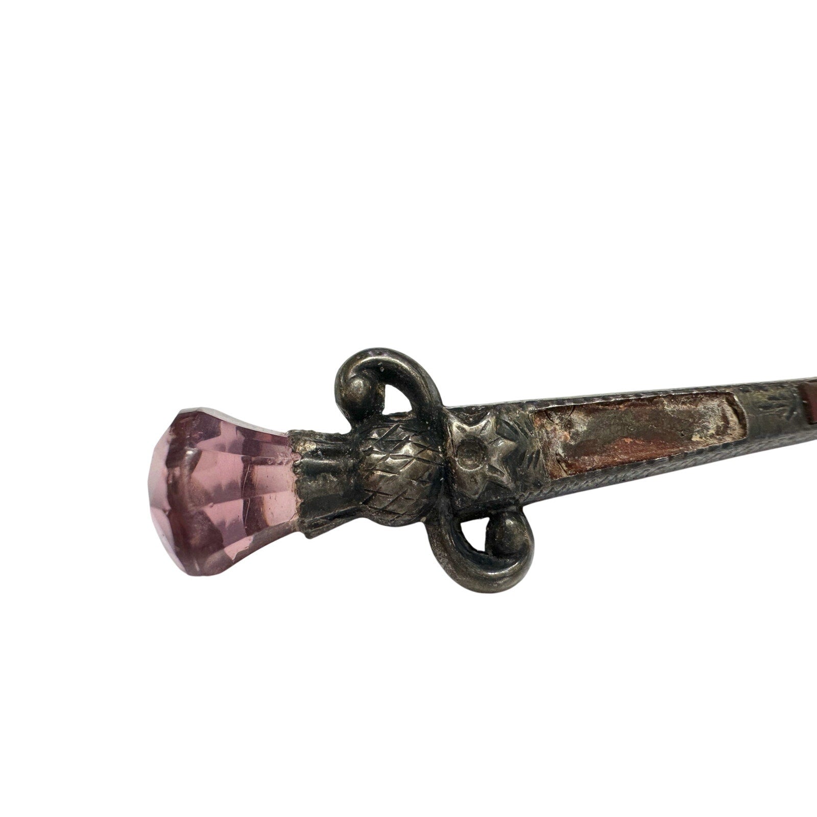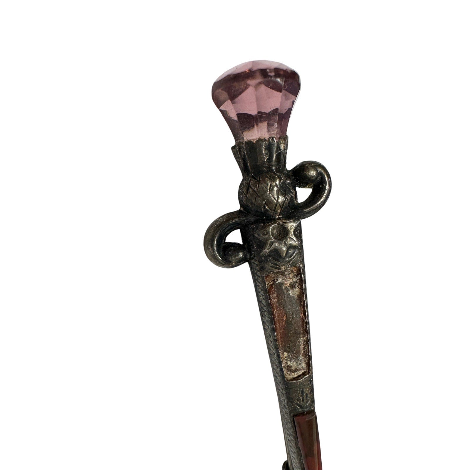 1800's Scottish Dirk Brooch / Pin - Made of sterling silver & shaped like a sword with Pink faceted gem on top and agate on shaft. One agate is missing. I saw online it was also known as a kilt pin, but I'm not sure.