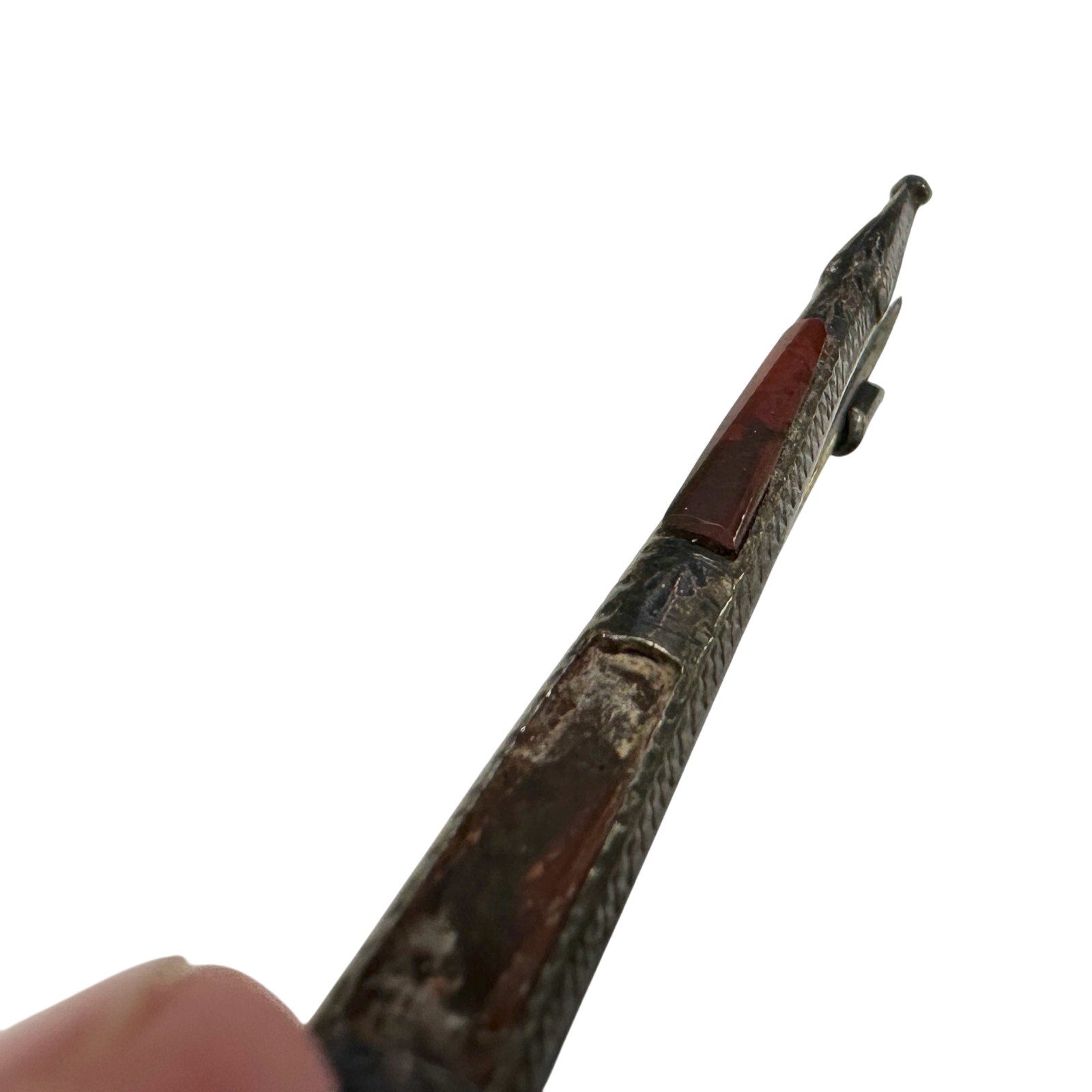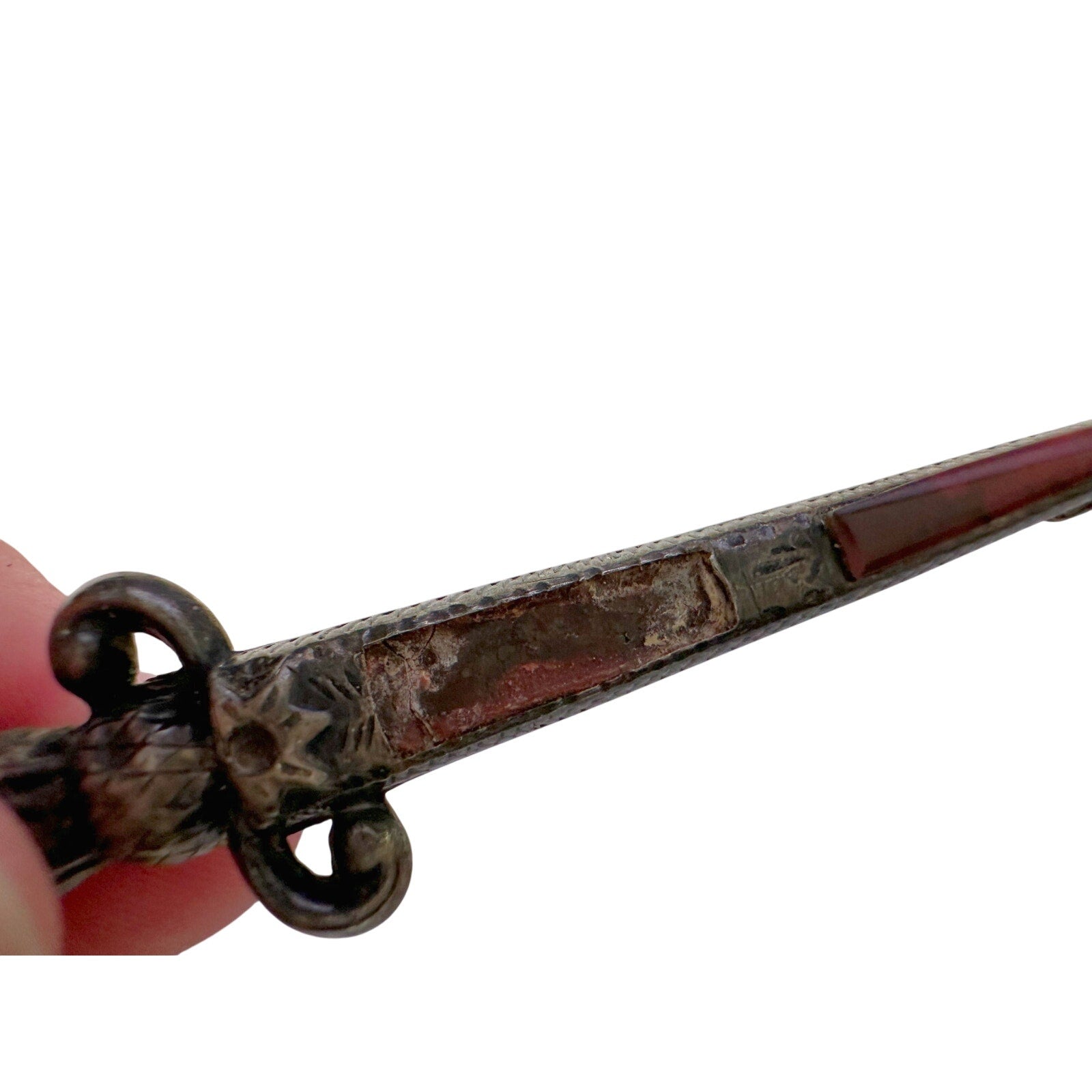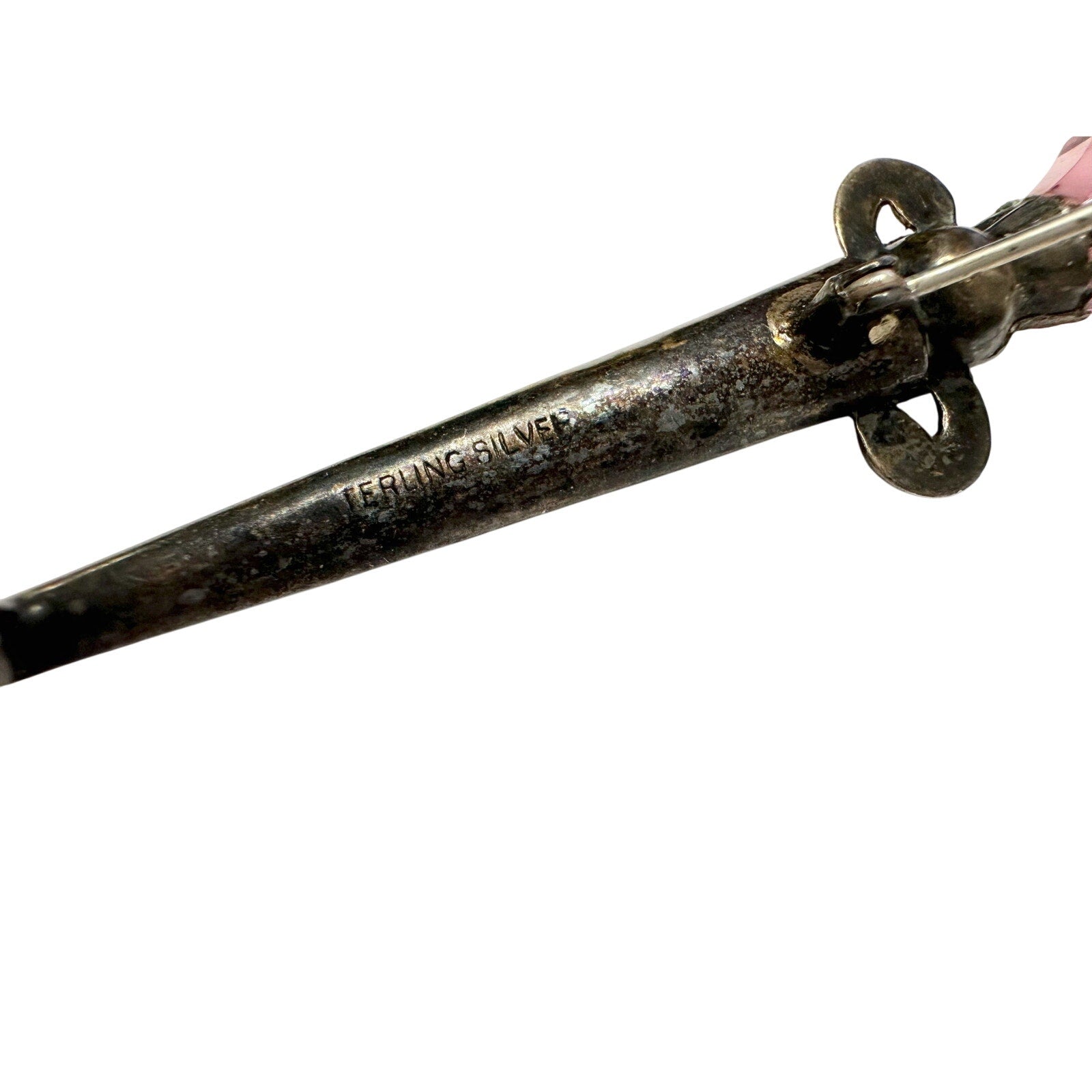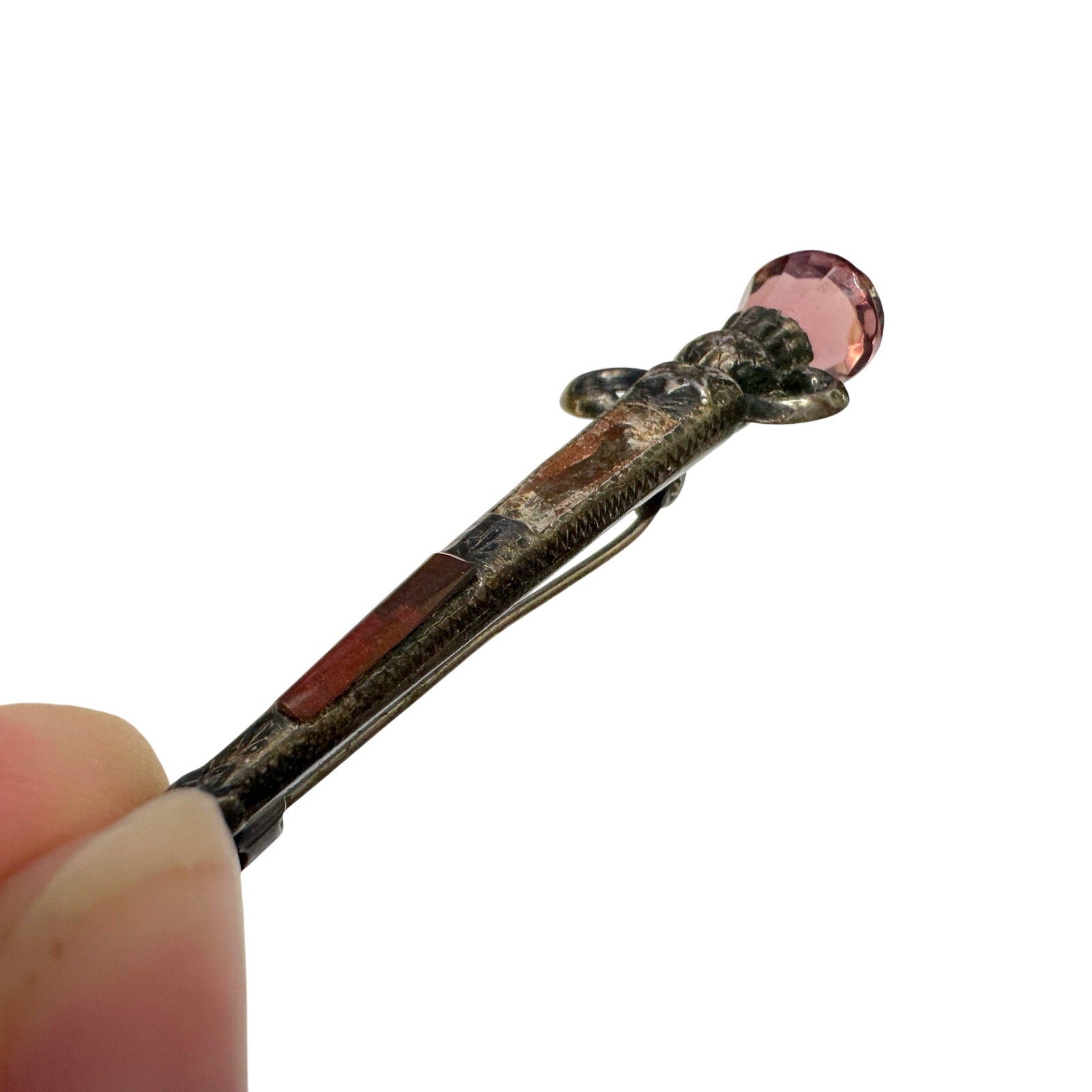1800's Scottish Dirk Brooch / Pin - Made of sterling silver & shaped like a sword with Pink faceted gem on top and agate on shaft. One agate is missing. I saw online it was also known as a kilt pin, but I'm not sure.