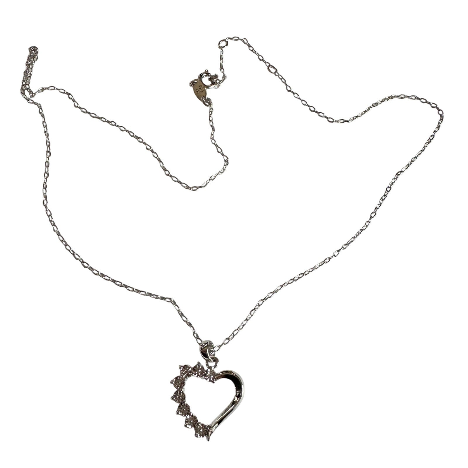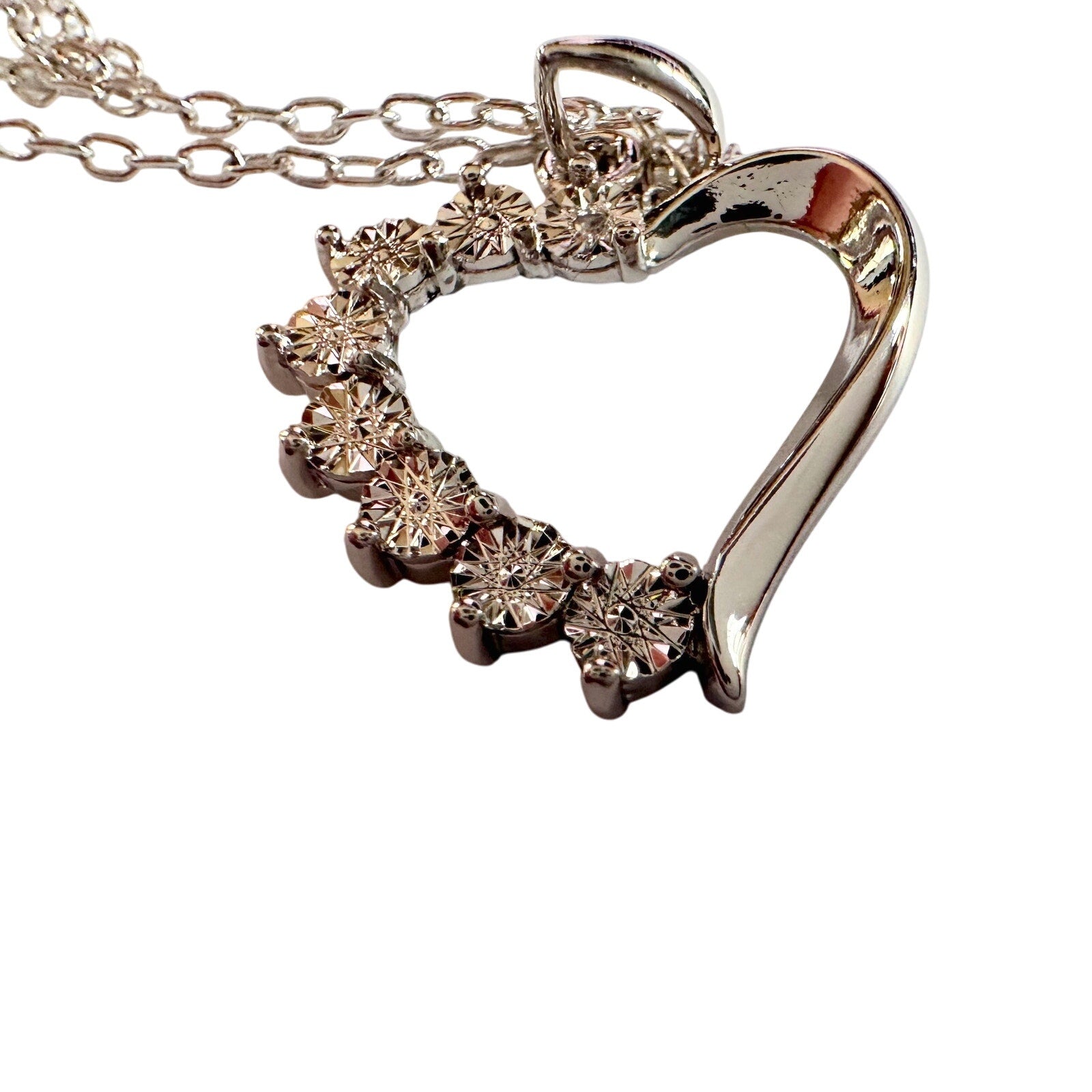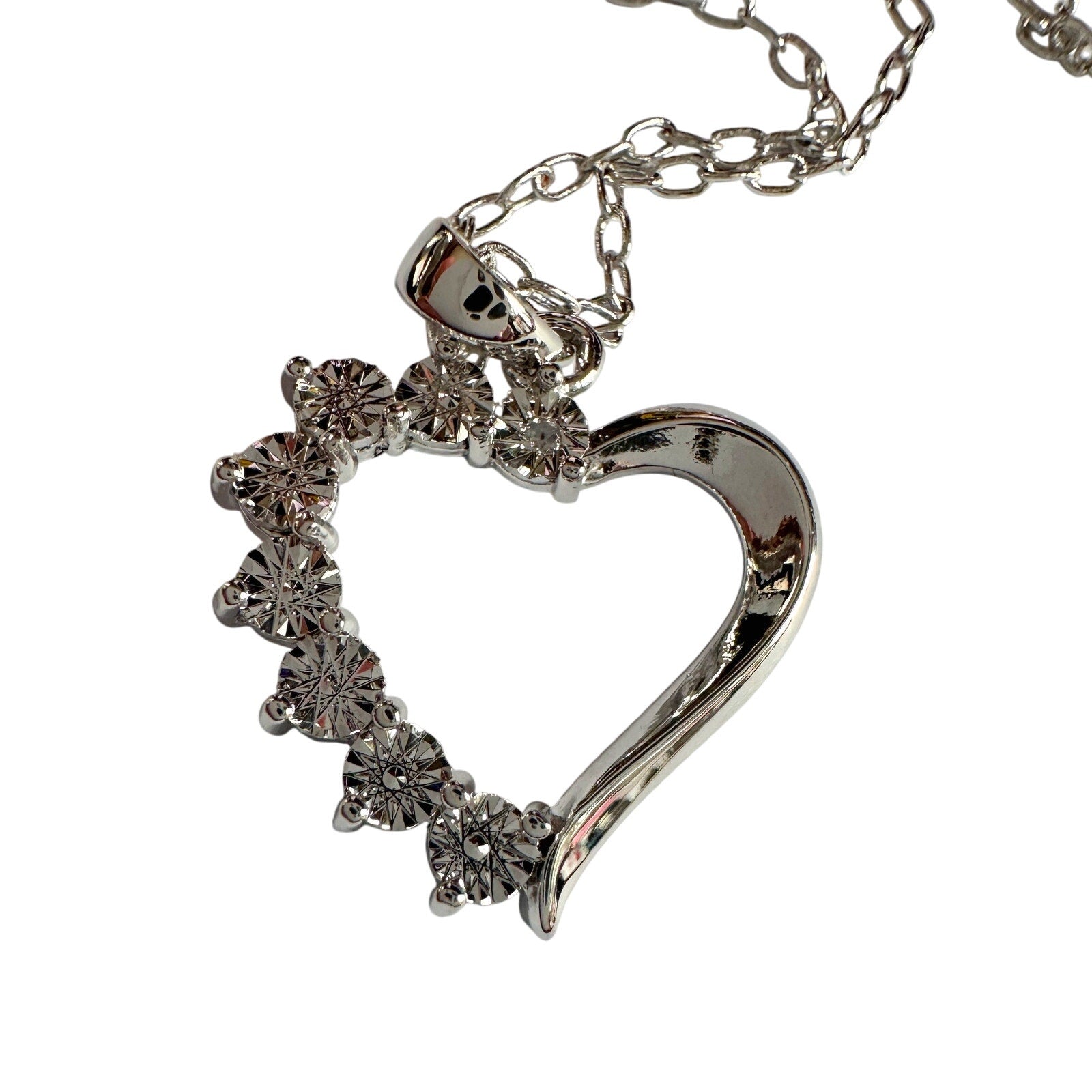 Beautiful shiny heart necklace. Solid on one side, diamond accent with illusion settings. Rhodium overlaying brass for pendant and chain.