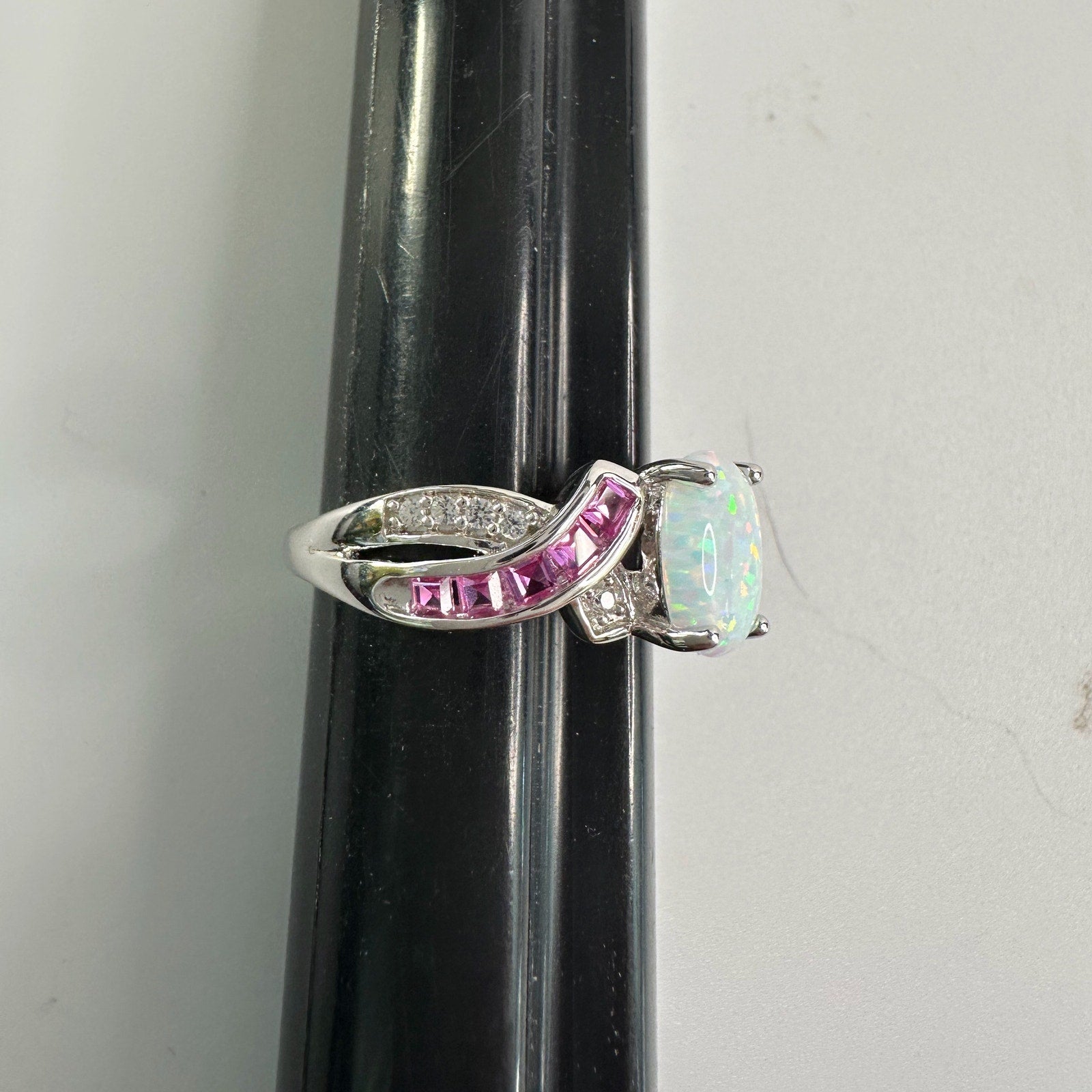 Large Oval Opal (lab created, 0.7 ct ctw) ring. Channel Set 0.6 ctw Lab created Pink Sapphires in one shank of the band and 0.30 ctw white sapphires prong-set on other shank. Shiny and eye-catching ring.