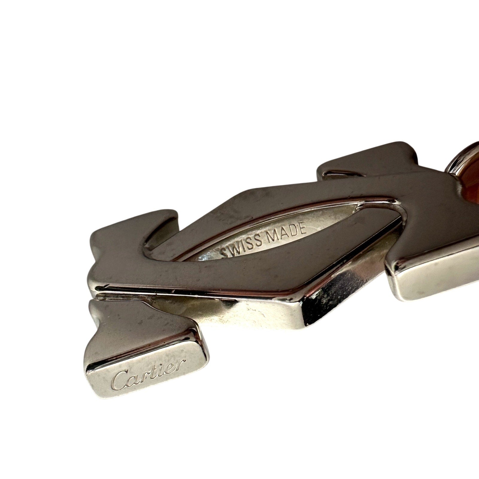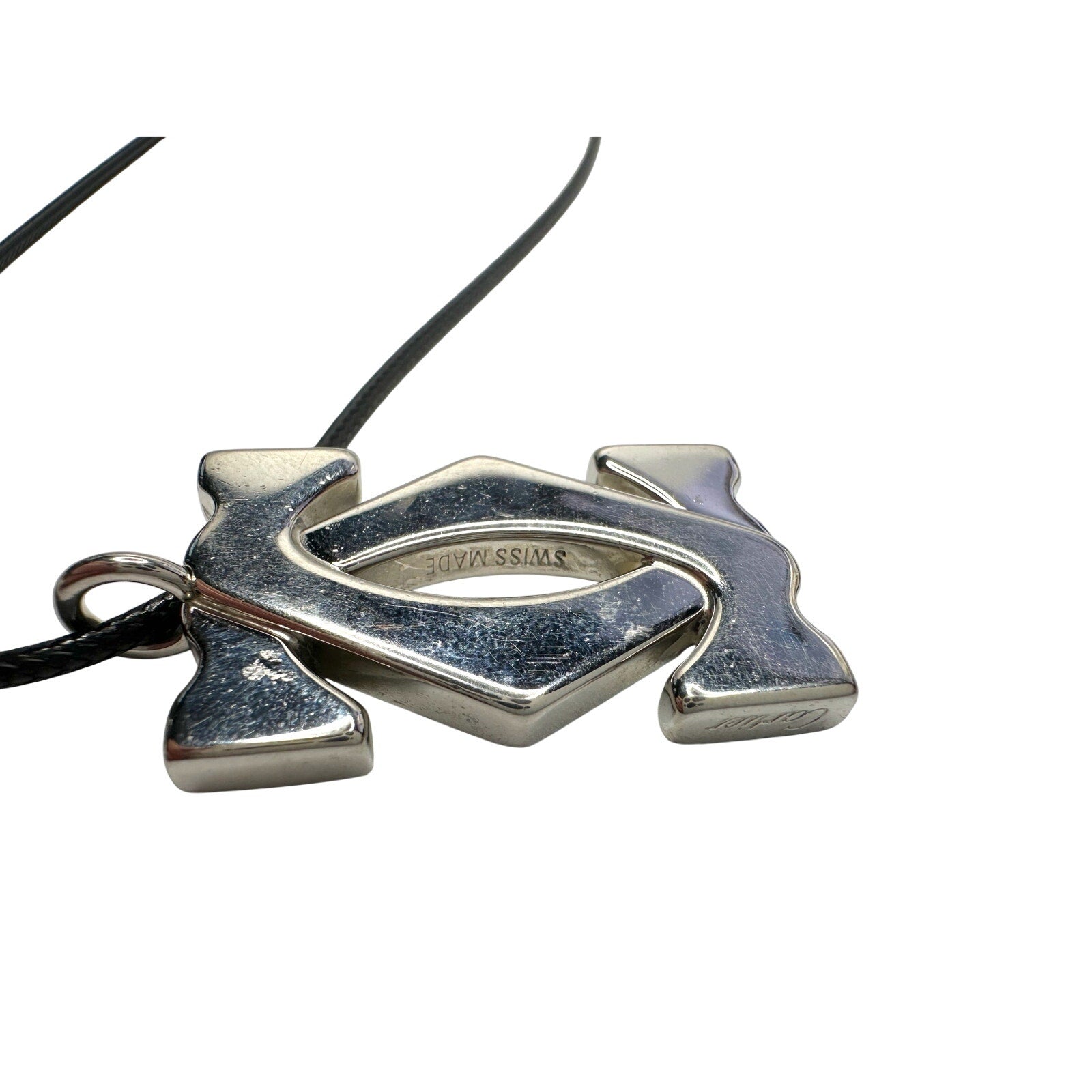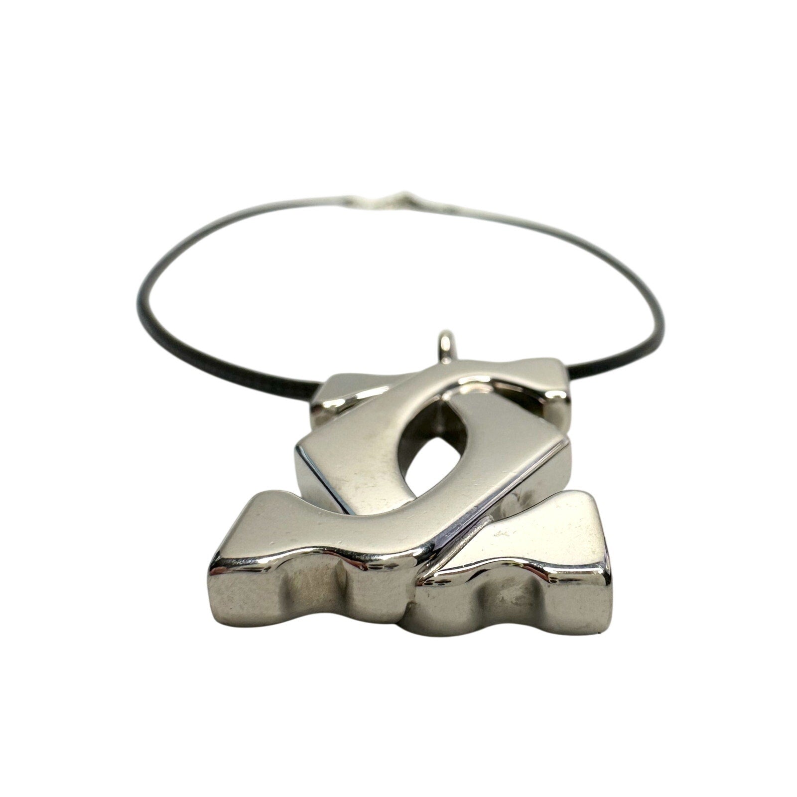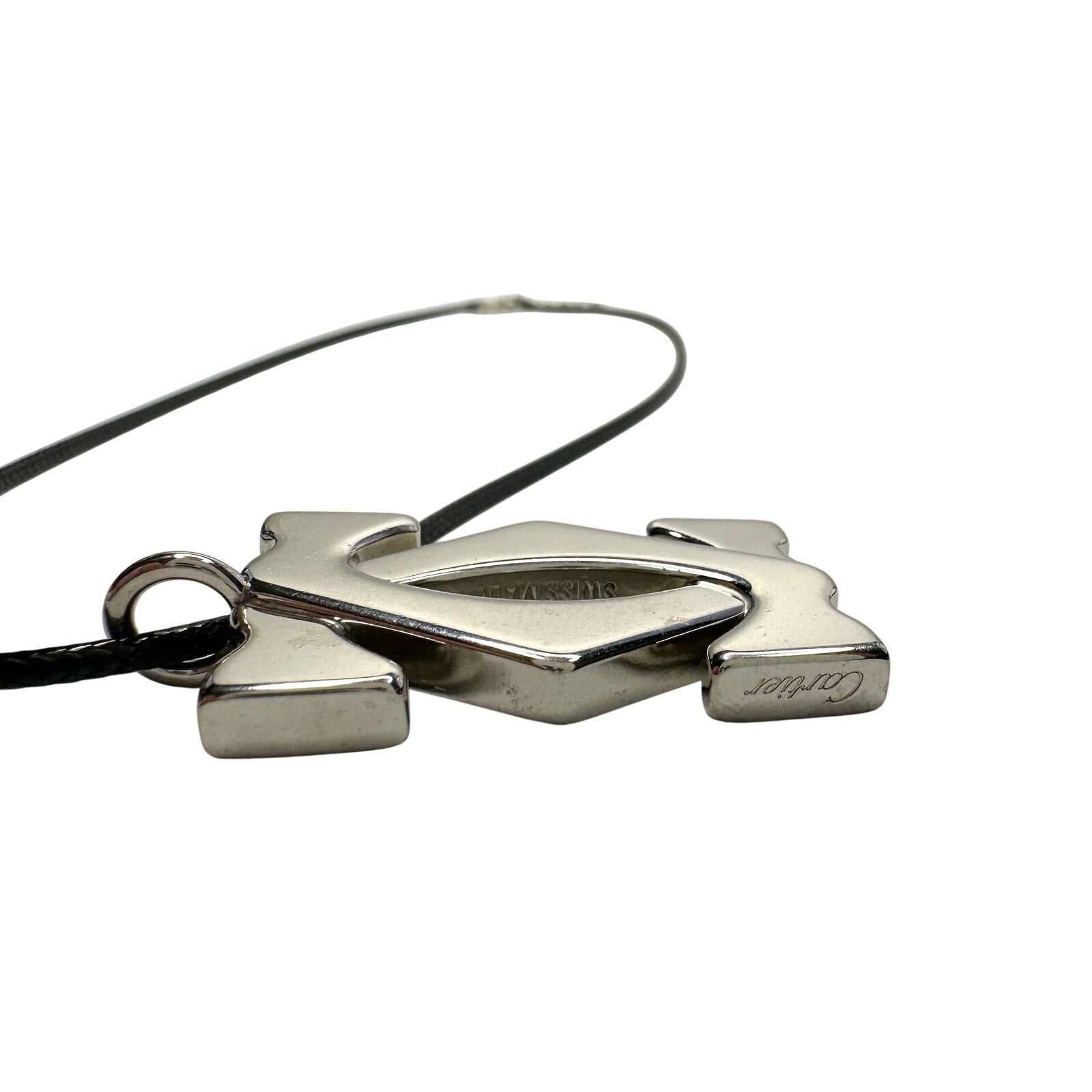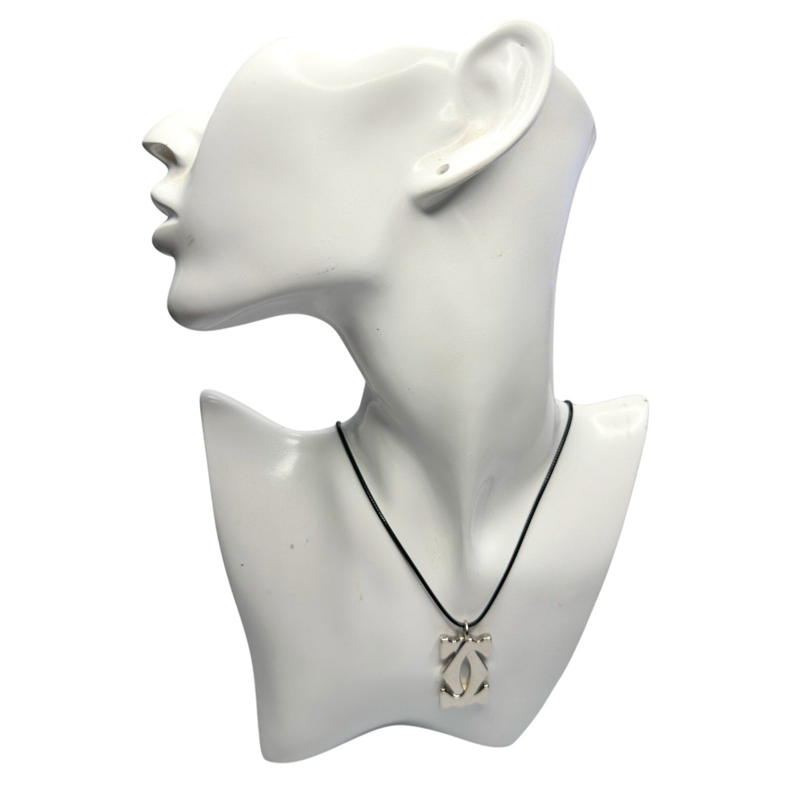 Cartier logo Double C Pendant. Silver tone, thick design. Approx 3.5" tall with loop. Stamped 'Cartier' on end of one C and "Swiss Made" on inside of one C. Comes with unbranded leather necklace chain shown.