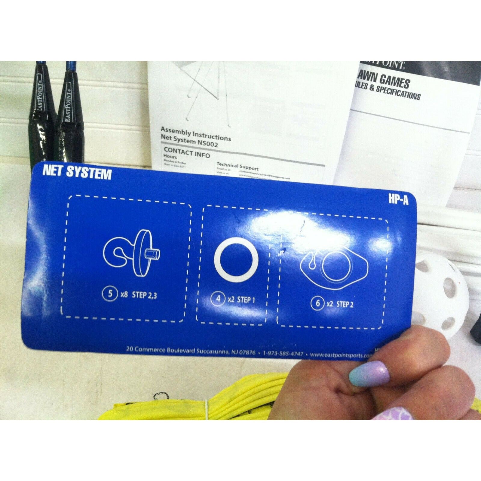 Includes instructions for net system and booklet of rules/instructions for many lawn games.