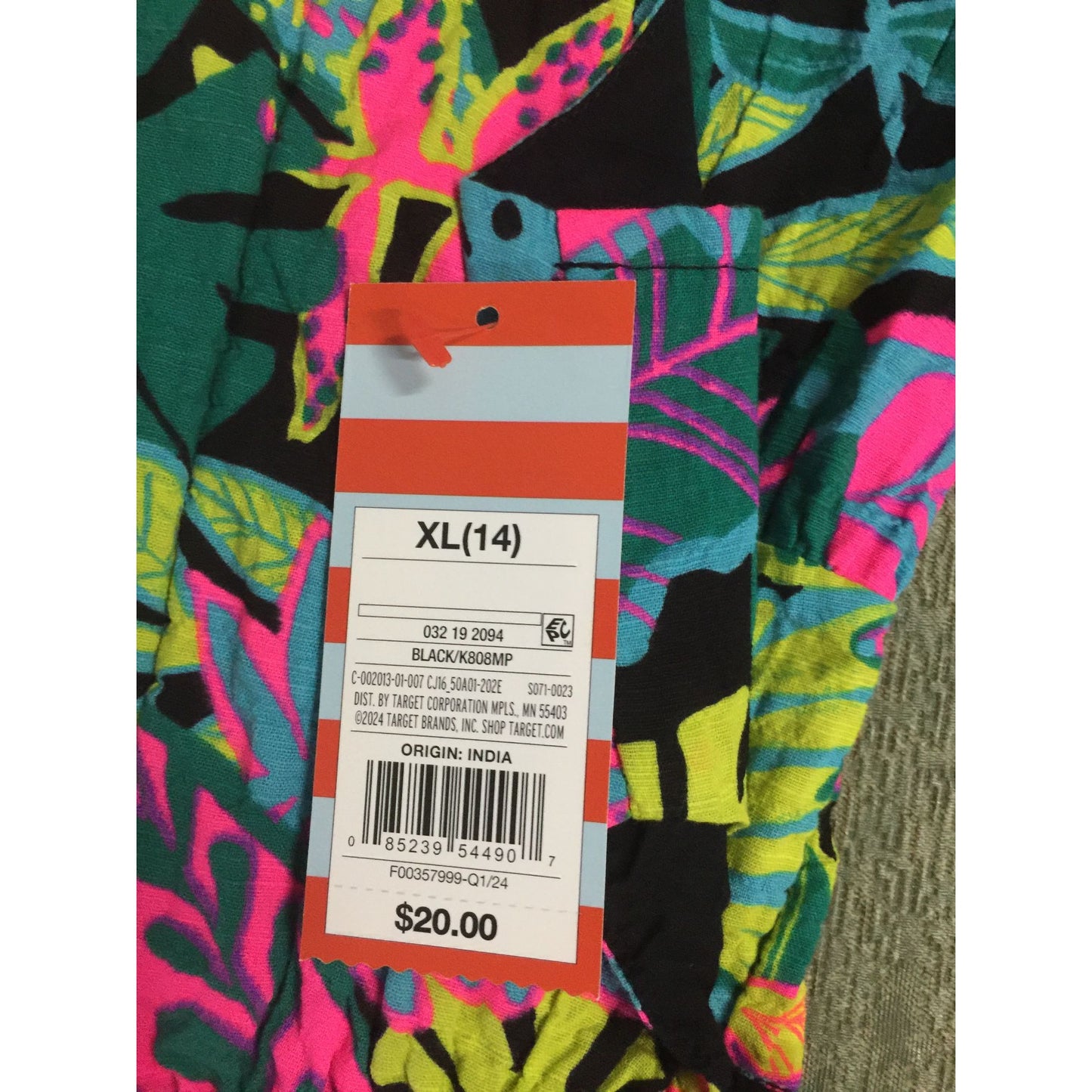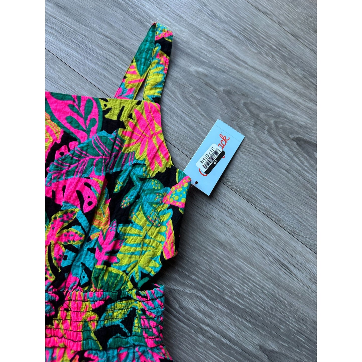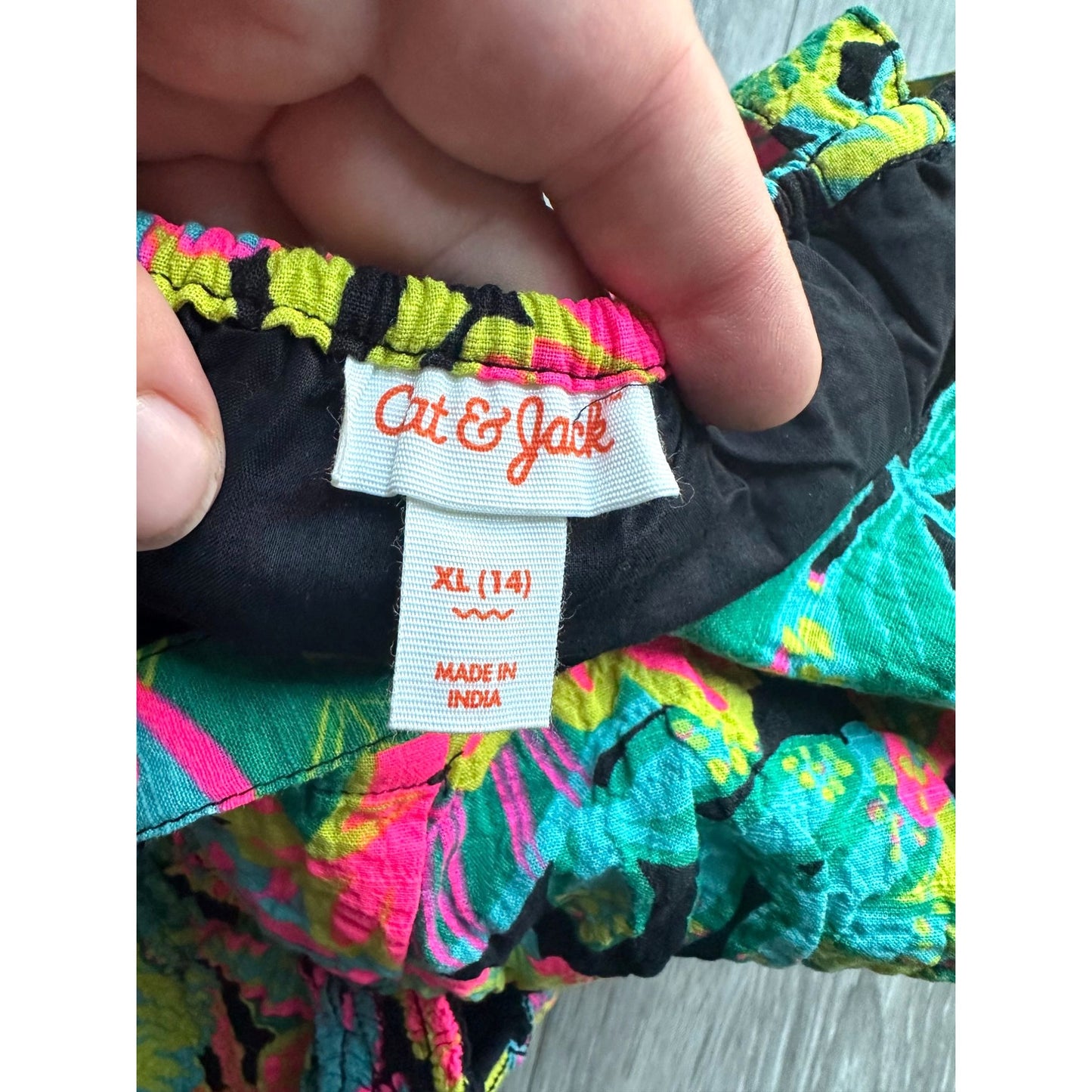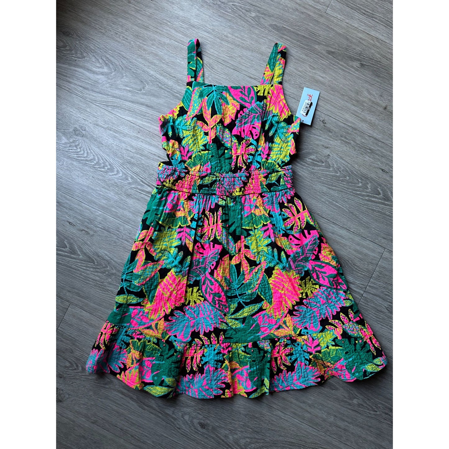 Girls size large tropical print sundress. Black with bright colors (pink, green, yellow, blue). Vivid & Fun. Small cutouts at waist. Pockets!