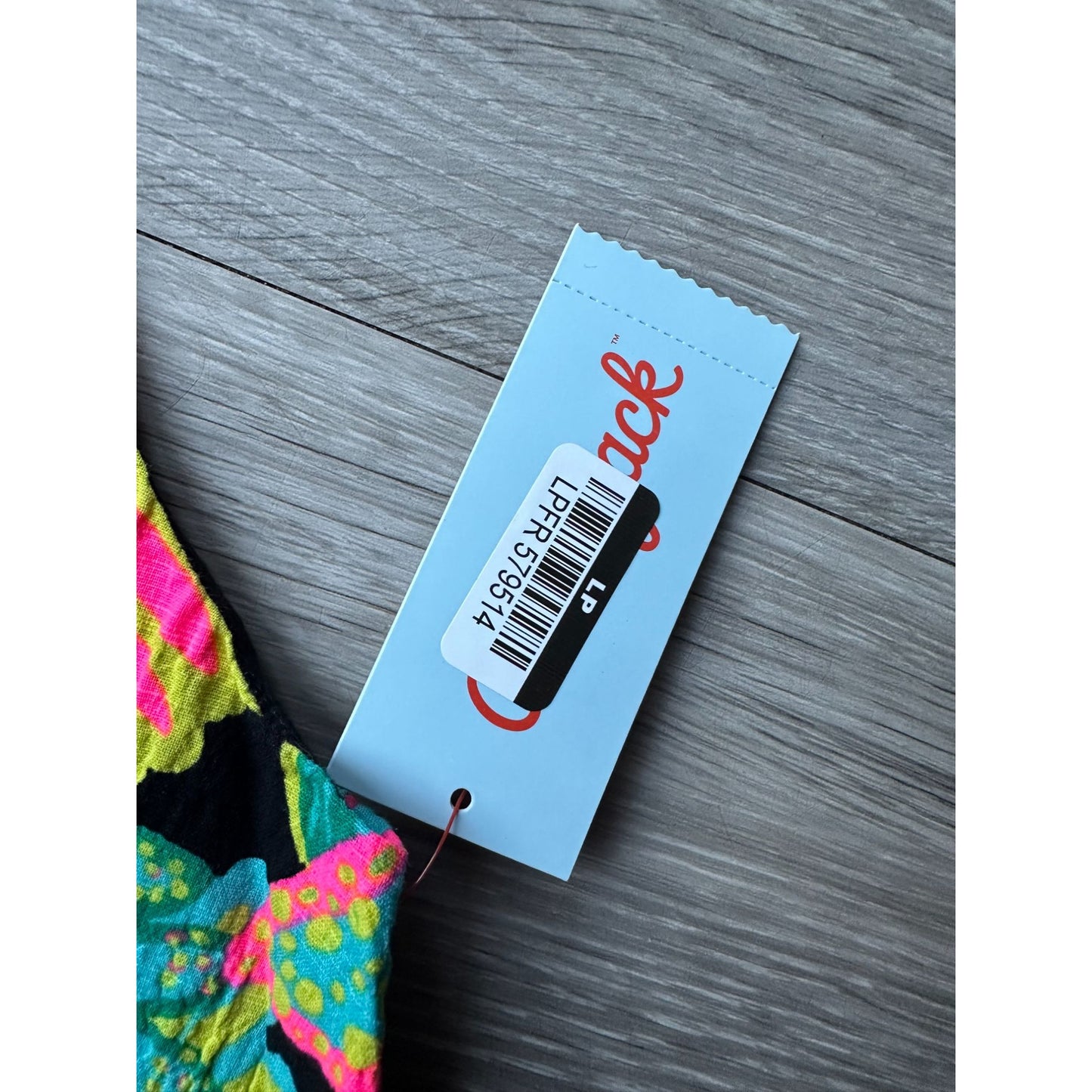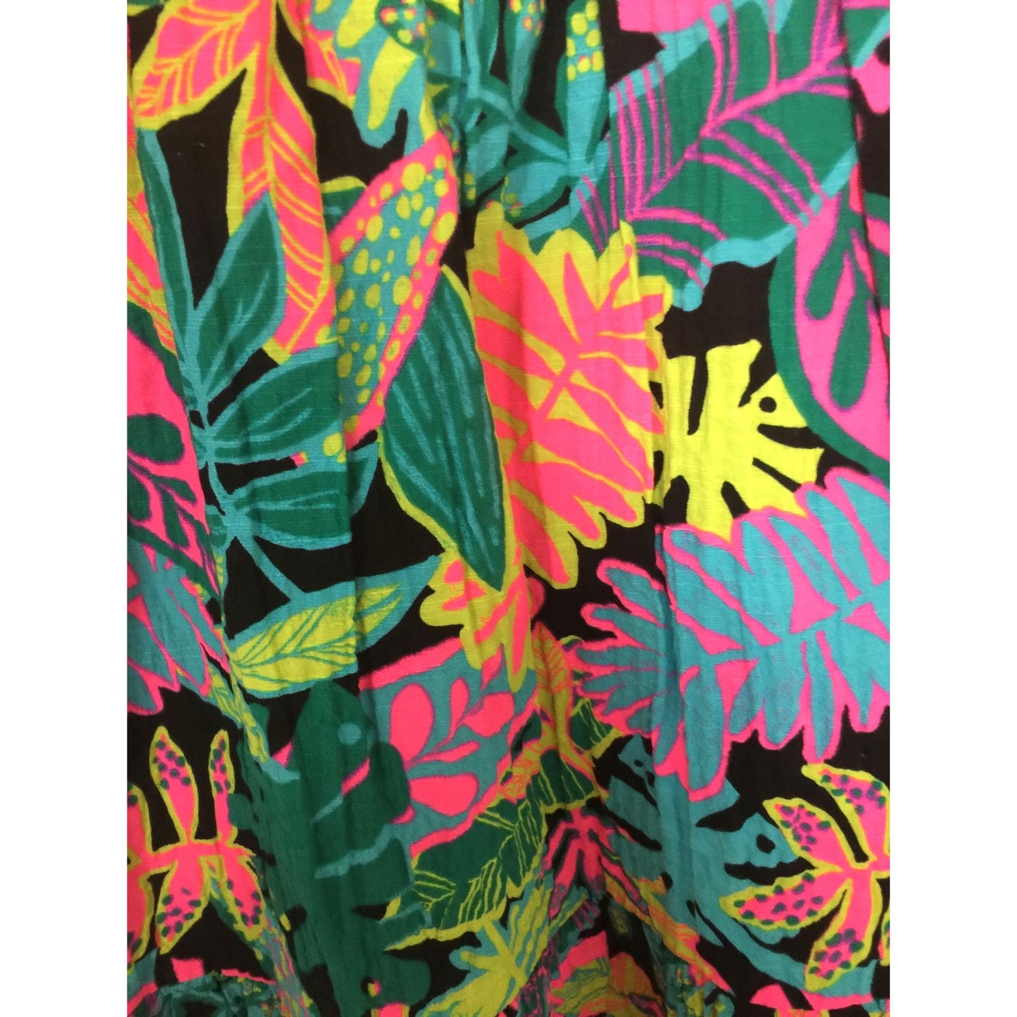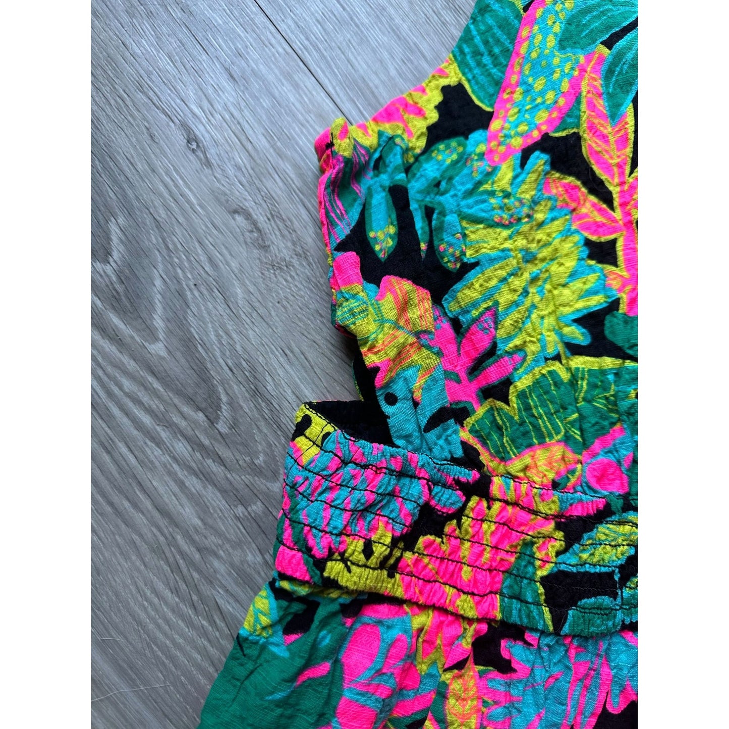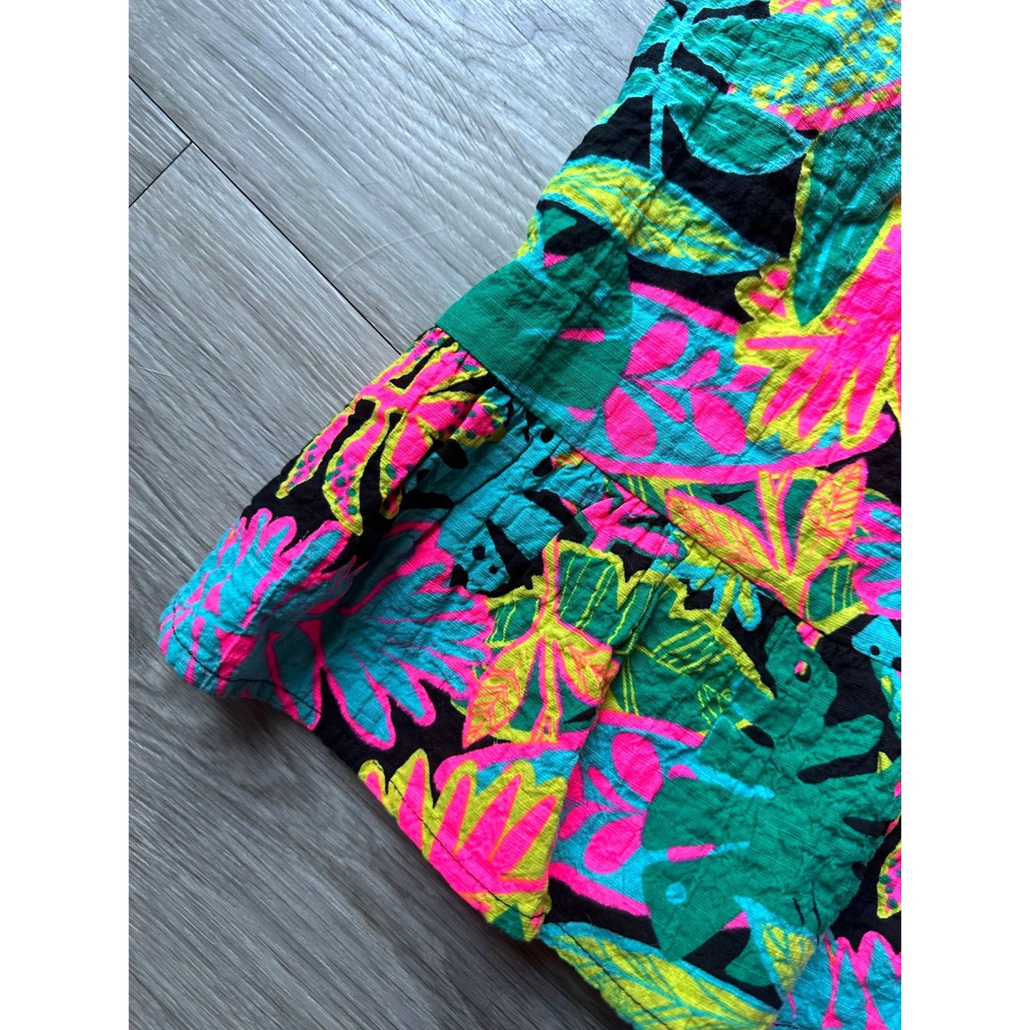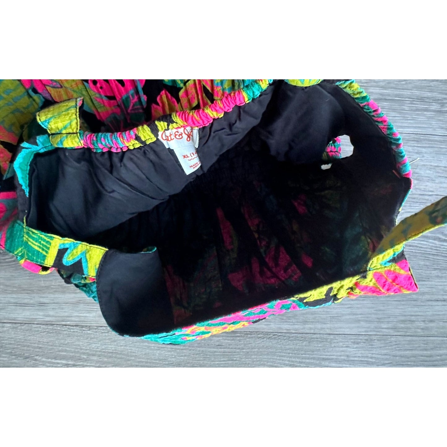 Girls size large tropical print sundress. Black with bright colors (pink, green, yellow, blue). Vivid & Fun. Small cutouts at waist. Pockets!