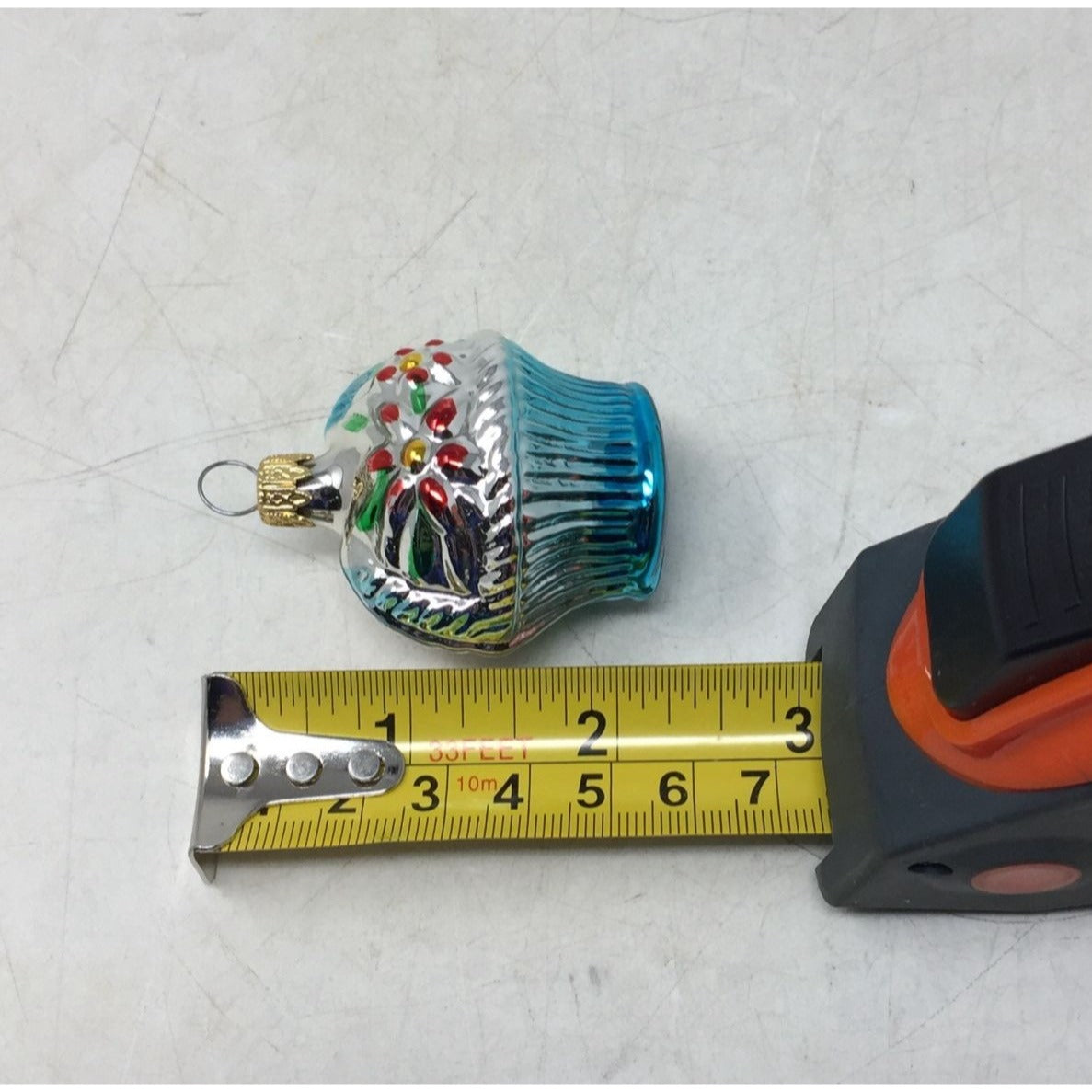 Glass Christmas Ornament Shaped Like a Floral Basket Blue w Red Flowers