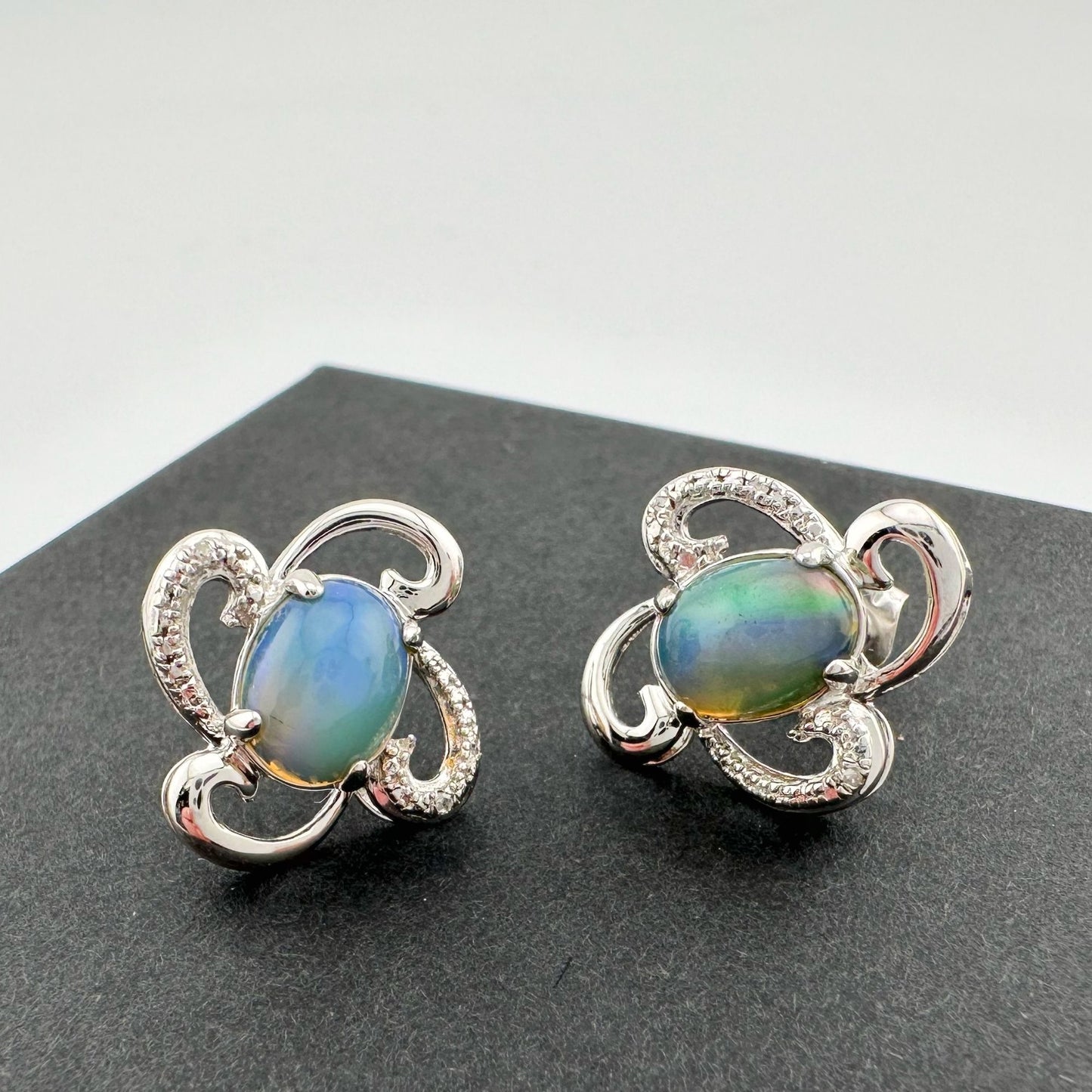 Beautiful sterling silver detailing on these cabochon black opal earrings. Colors change depending on your angle of view. Natural Gemstones. Small diamond accent.