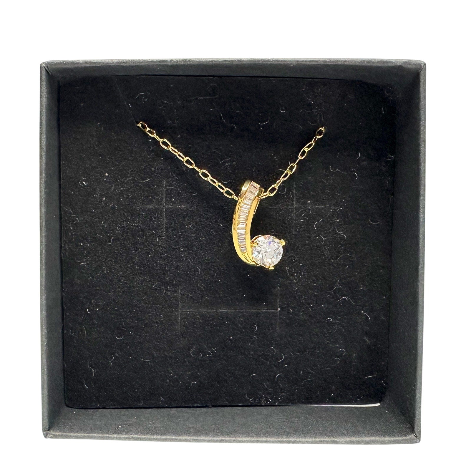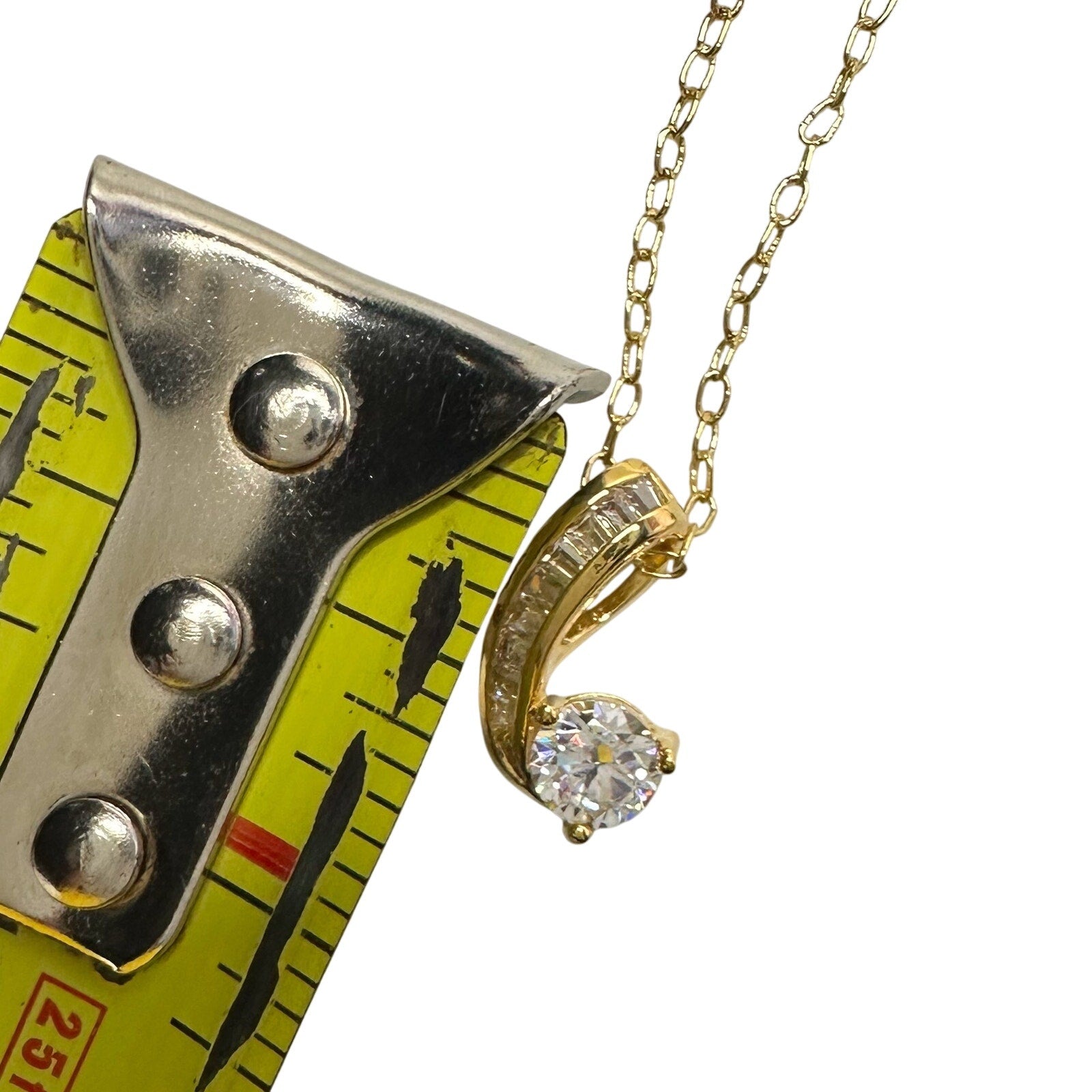 Pretty and shiny topaz and zirconia necklace. Large Cubic Zirconia stone and channel of baguette cut white topaz on a curved asymmetrical setting. Chain is 19" long but also has loops to clasp at 17" and 15". 18kt Gold overlaying brass.