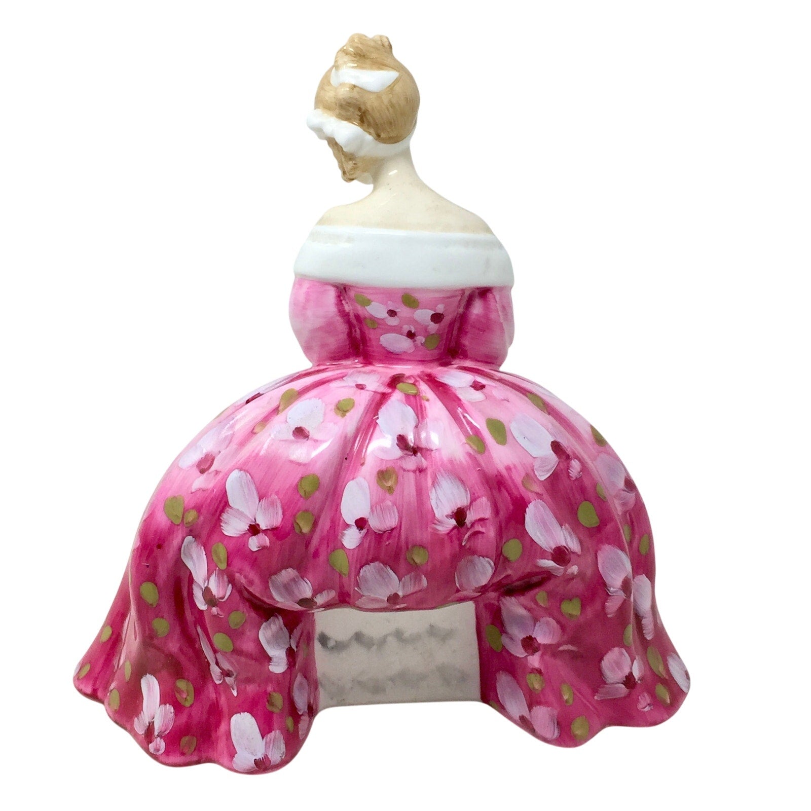 Vintage "Victoria" figurine from Royal Doulton's 'Pretty Ladies Collection'. Beautiful woman with light hair up in bun wearing a beautiful pink floral hand-painted dress. She is sitting on a box with a small white fan in her hand.