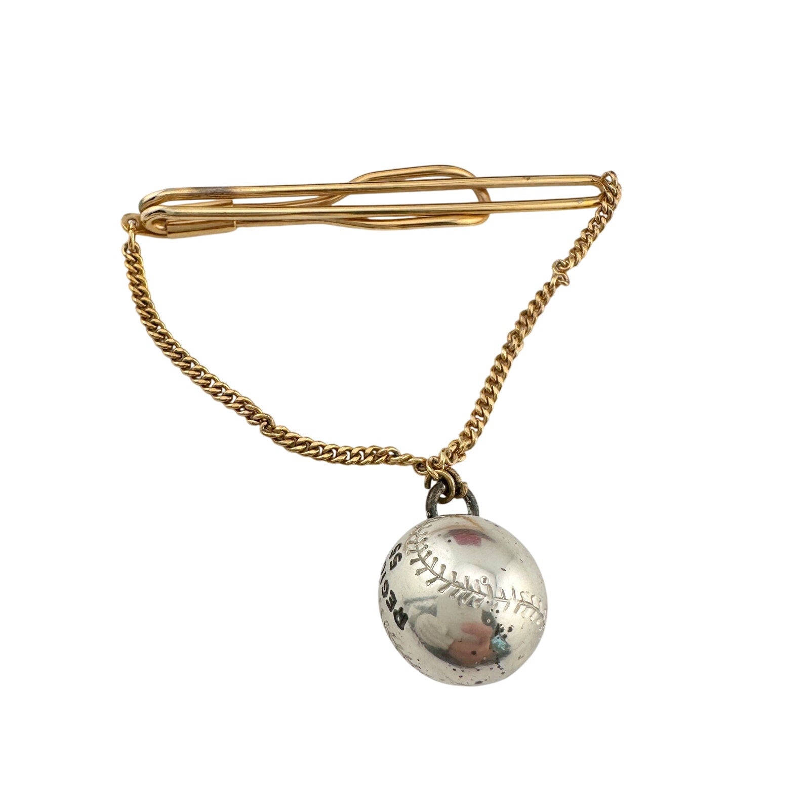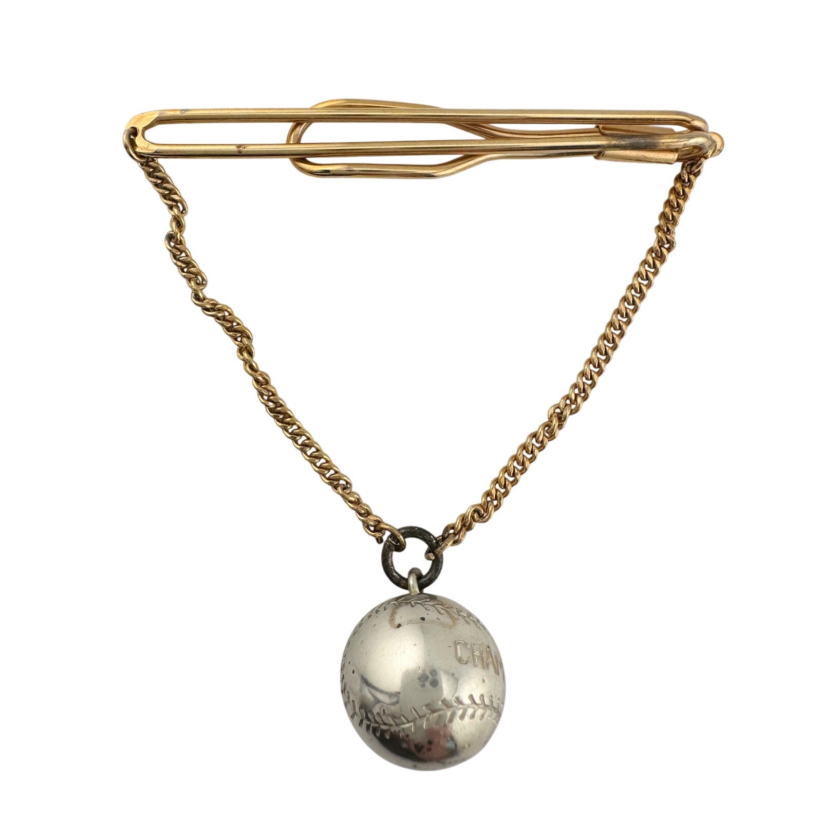 Tie bar made by Swank. Gold tone bar with shiny silver tone baseball or softball "CHAMPIONS" imprinted into the ball. "Region 4 - 55" in black on the side.