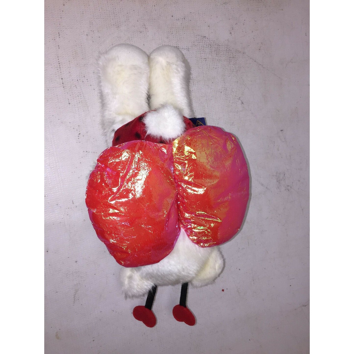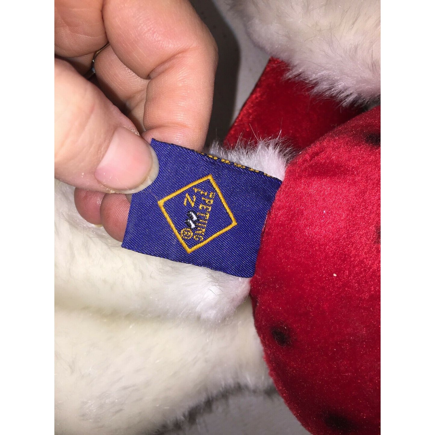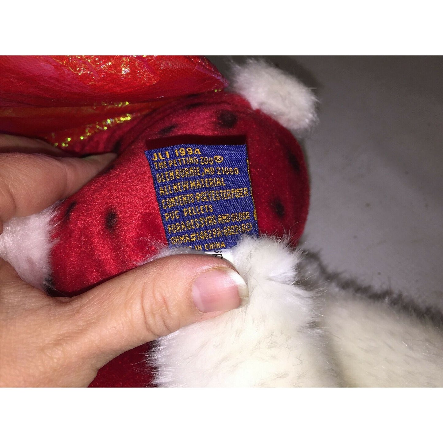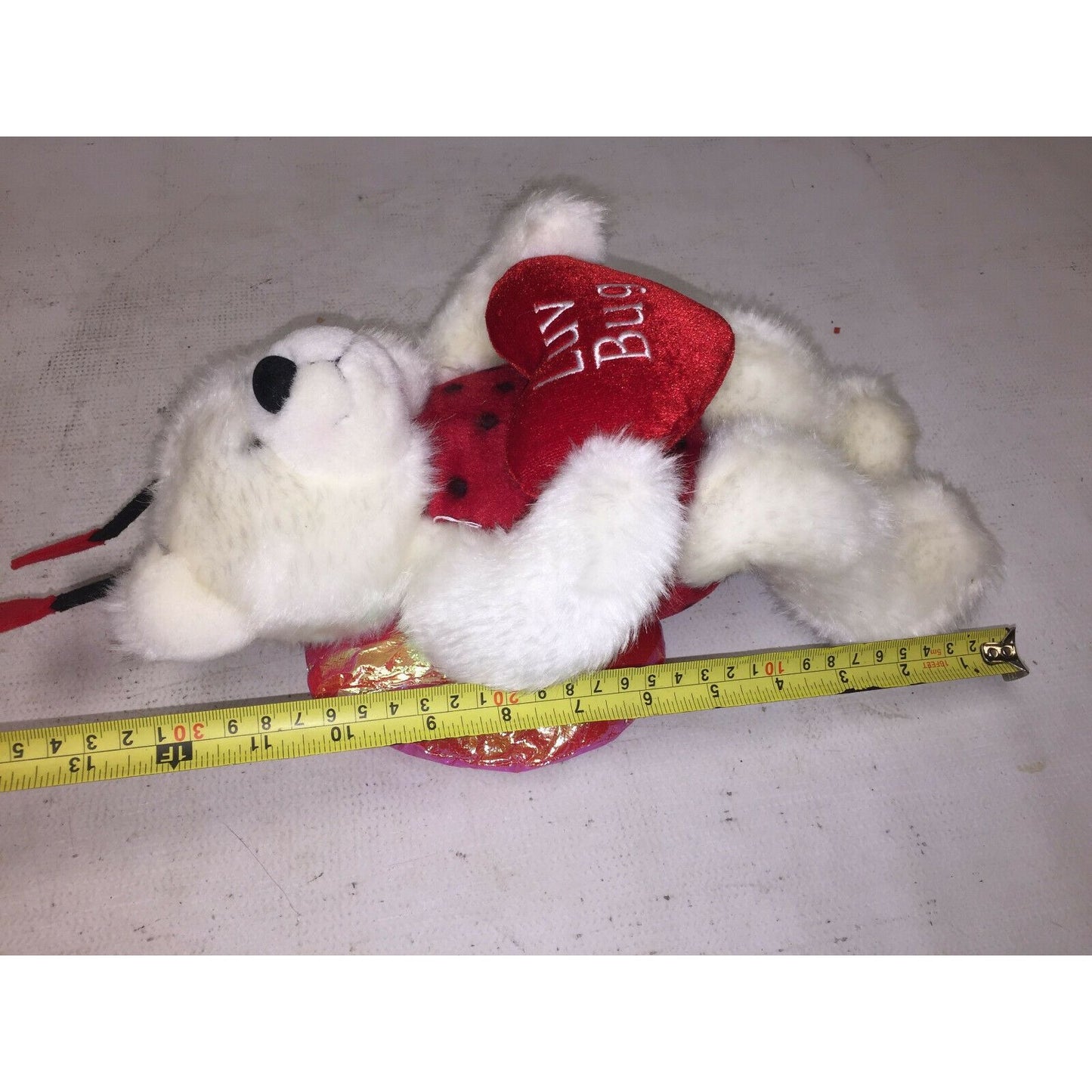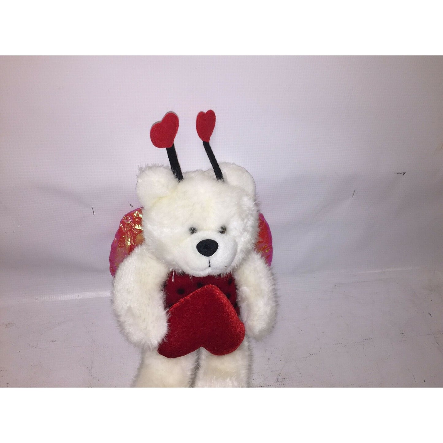 Cute and Fun White Teddy Bear Plush with red heart antennae and lady bug suit with wings. JLI 11994 - The Petting Zoo. Needs a good cleaning otherwise good vintage condition.