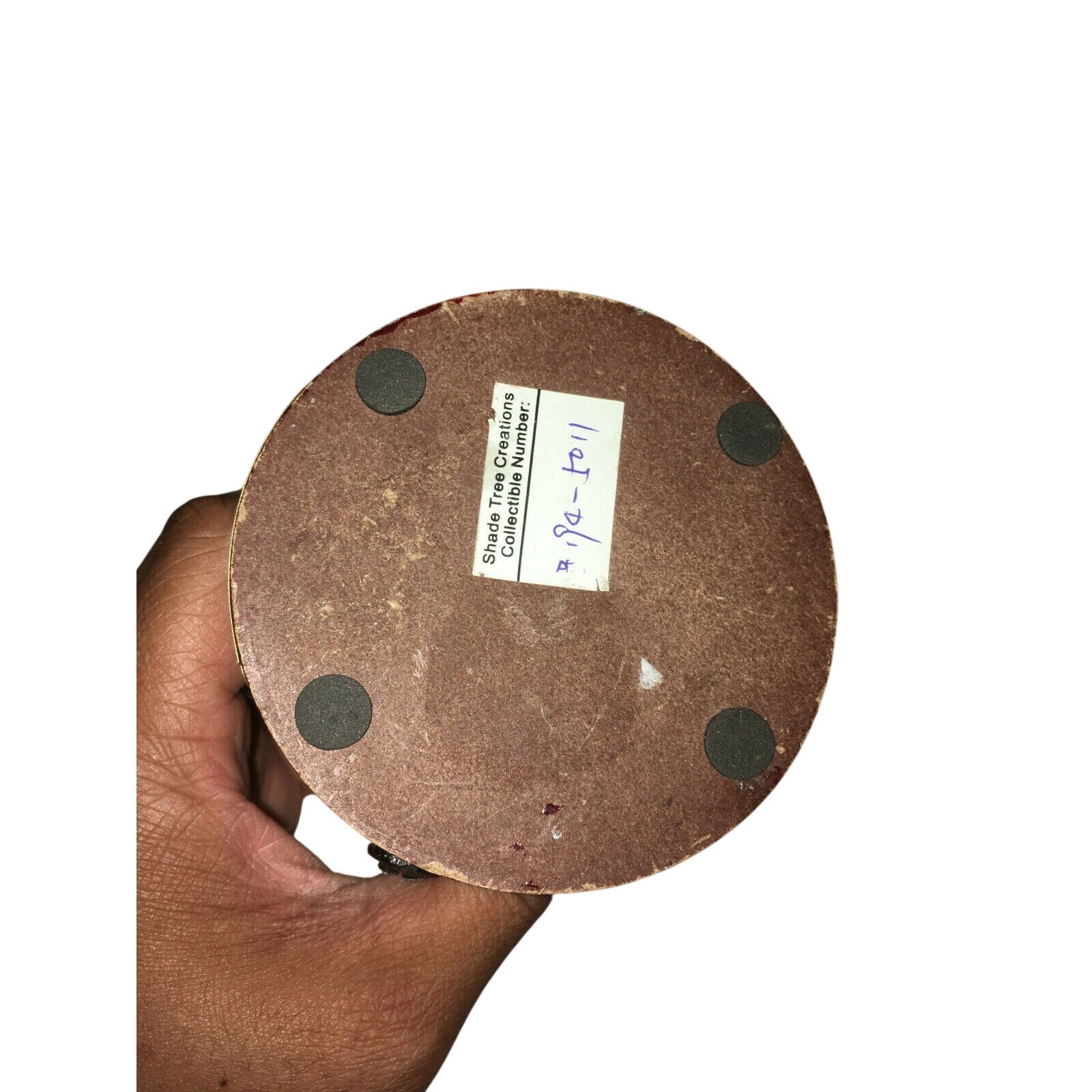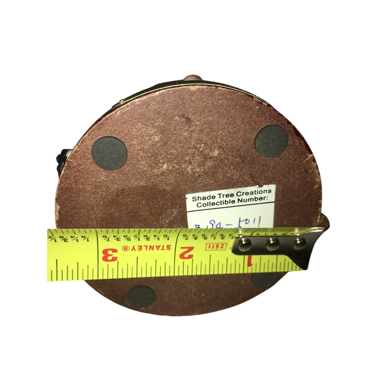 Man with large mustache, measuring tape, hat with ball on stop and large golf ball. Approx 4" tall.