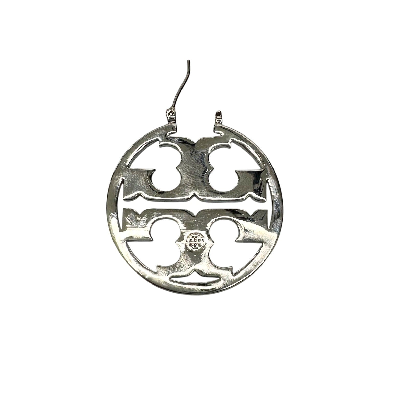 Tory Burch miller enamel hoop earrings. New and unused. Pink reflecting T's inside thick silver tone circle. Approx. 1.5" in diameter.