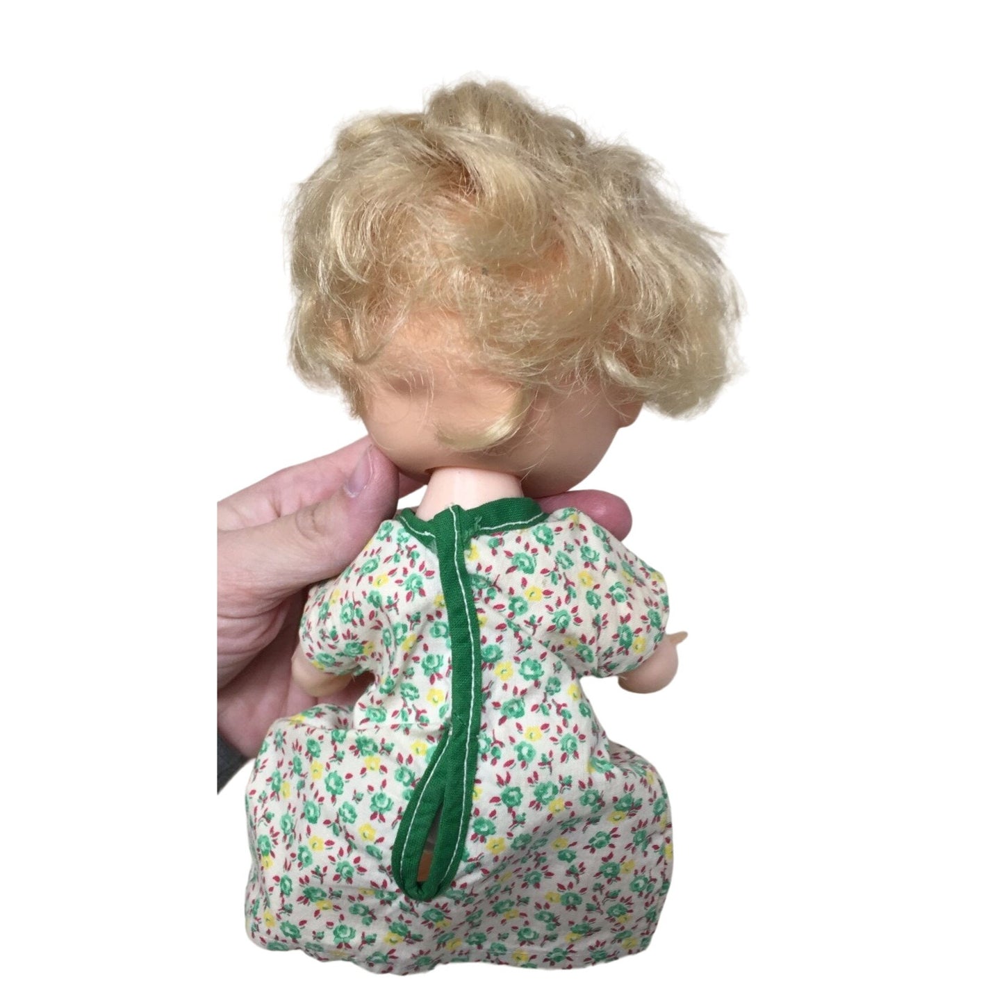 Vintage Collectible Baby Doll Blonde Hair/Green Floral Printed Dress- Rattles when you shake it