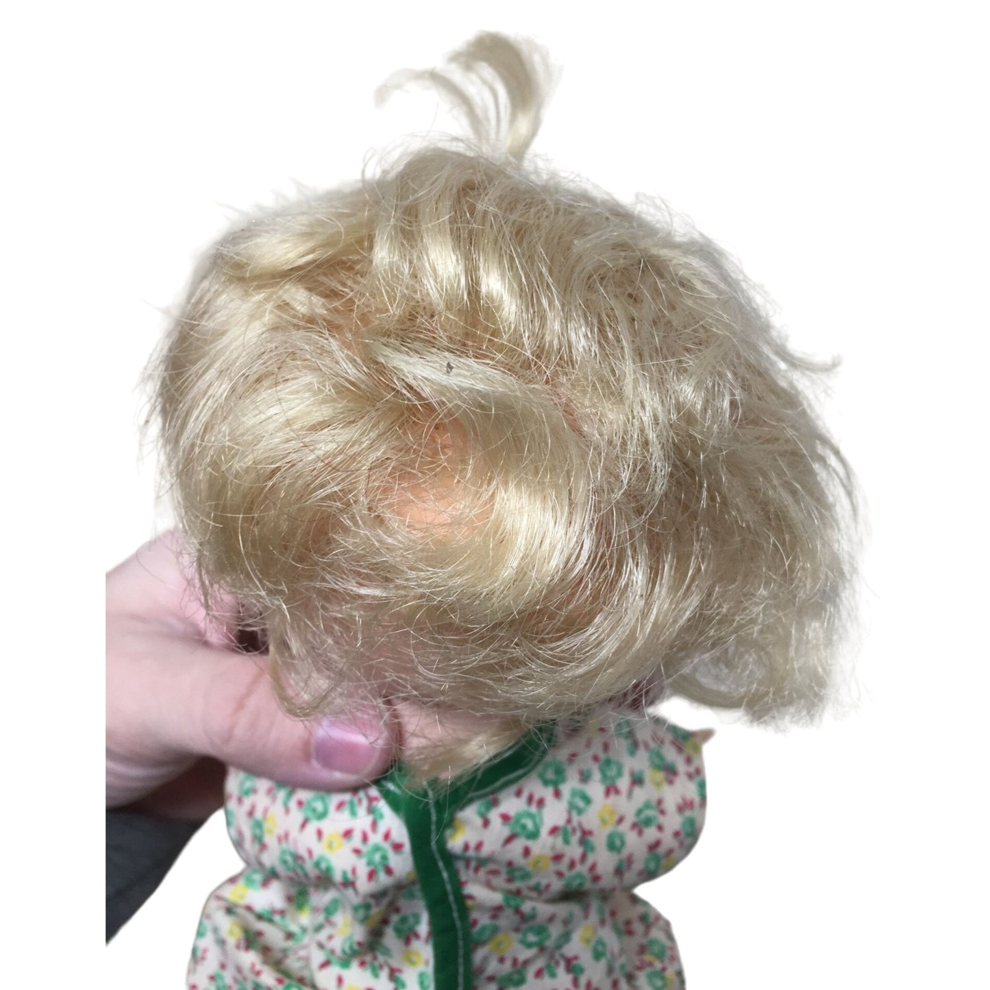 Vintage Collectible Baby Doll Blonde Hair/Blue Eyes/Green Floral Printed Dress- Rattles when you shake it