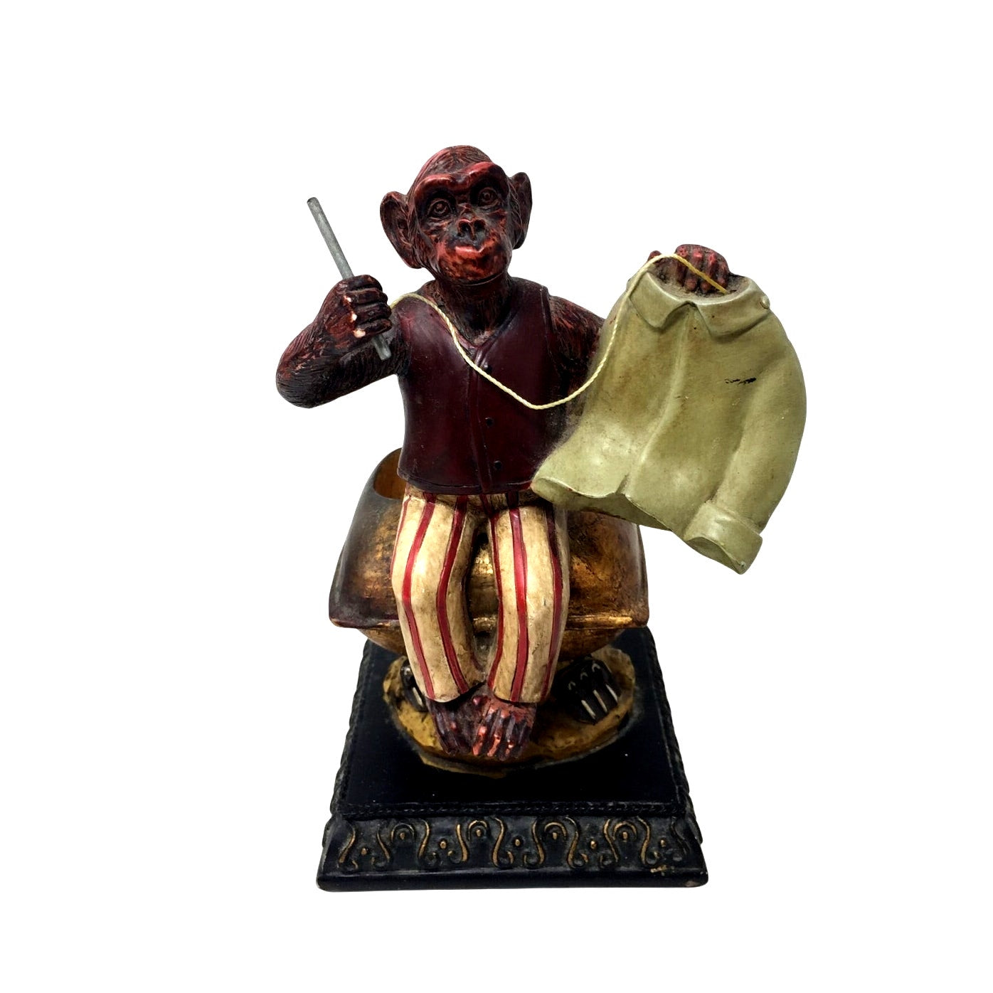 Content smiling monkey holding up a shirt and needle. Sewing with a thread. Wearing red and white stripe pants and a dark vest. Nice detailing to monkey and base.