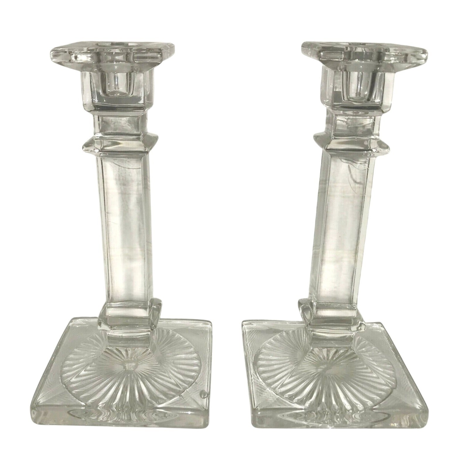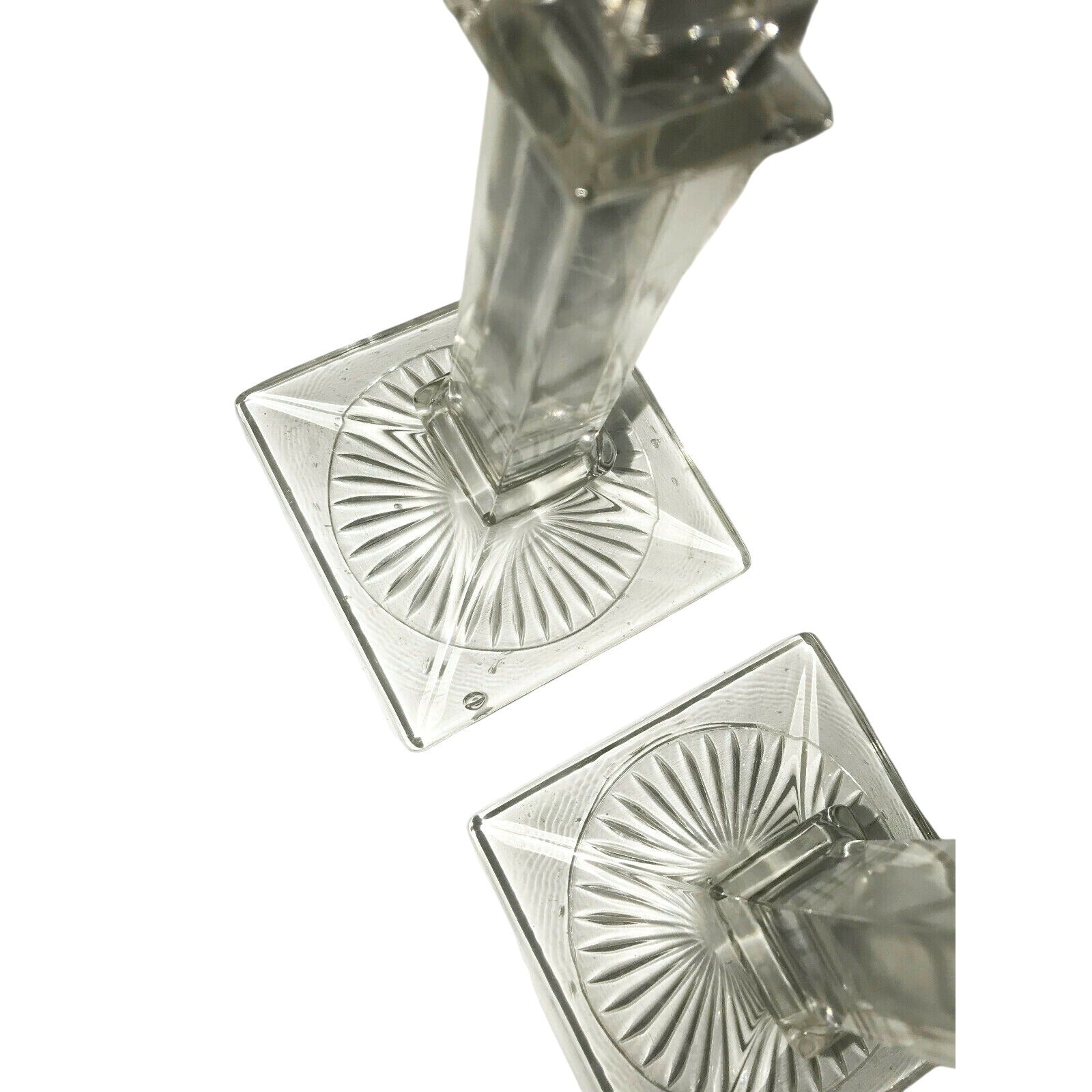 Pretty pair of clear glass candlestick holders. Strong square column design. Burst on bottom around column. Very structured. Nice Set.