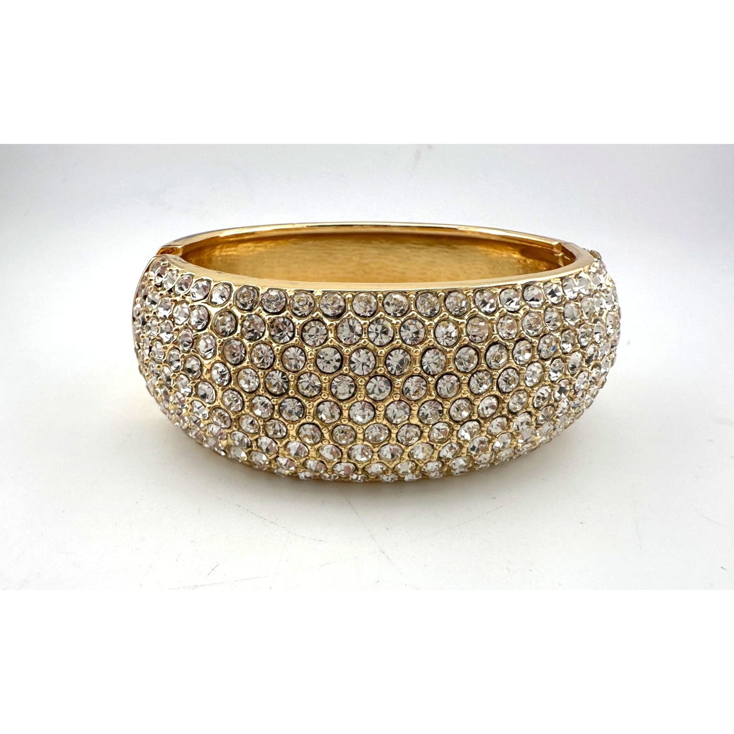 Eye-Catching Rhinestone Bangle Bracelet. 3" diameter. 1" wide. Hinged Clasp. Nickel-Free Metal.
