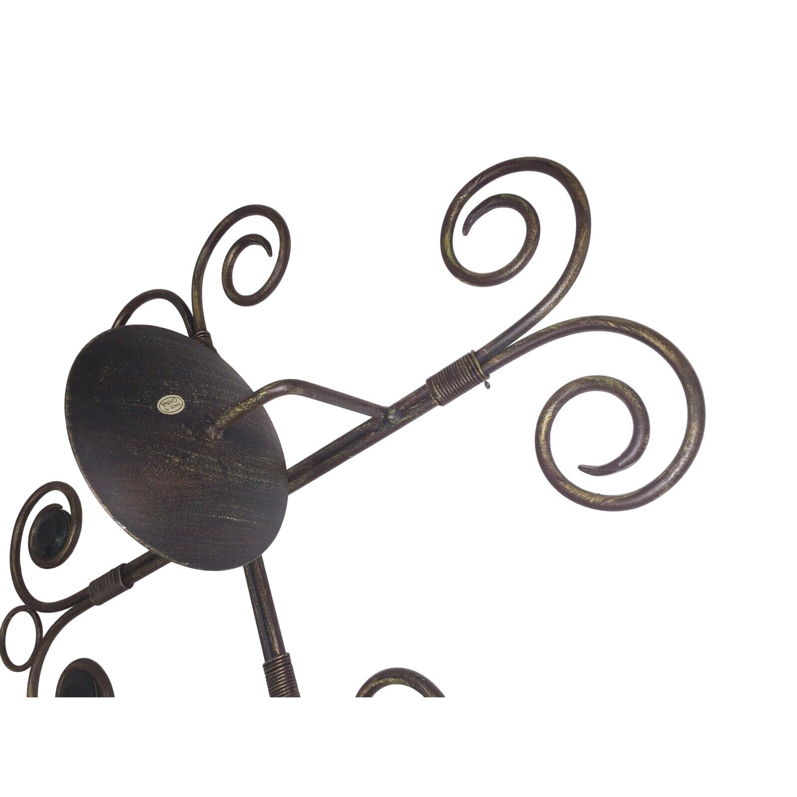 Made of metal, specifically wrought iron, known for its durability and classic appearance. The finish is a dark metal with light gold or bronze accents, giving it a distressed or aged look.