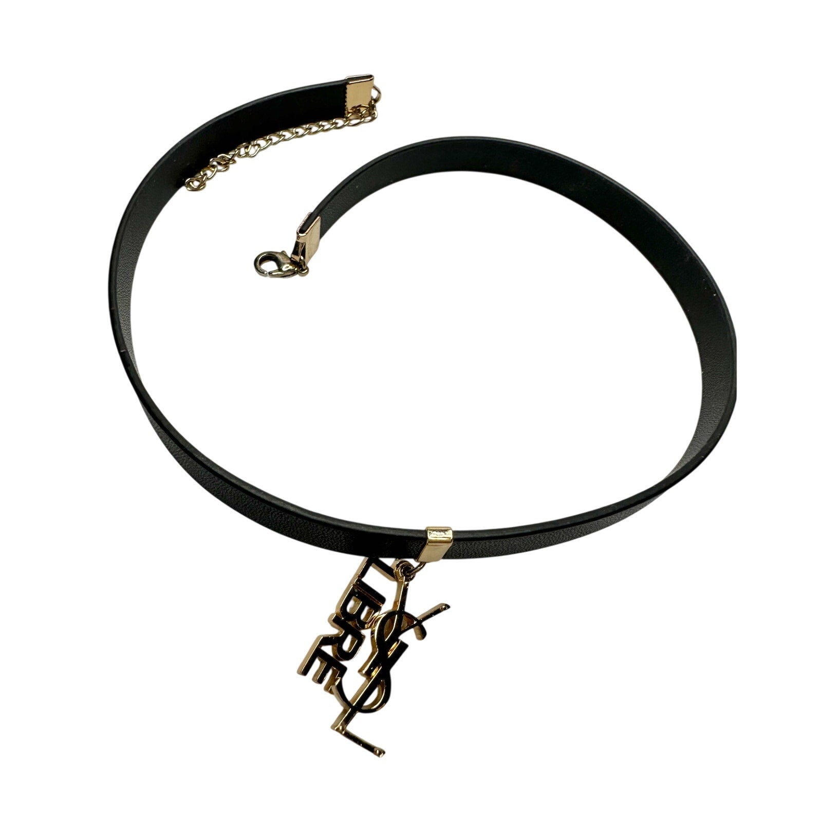 Yves Saint Laurent YSL Beaute Black Leatherette (Imitation leather) Choker or Bracelet with vertical 'YSL' & 'Libre' Charms. Gold tone hardware. 'Yves Saint Laurent Beaute' Imprinted on backside. Approx. 13" long with 2" extension. Original box included.