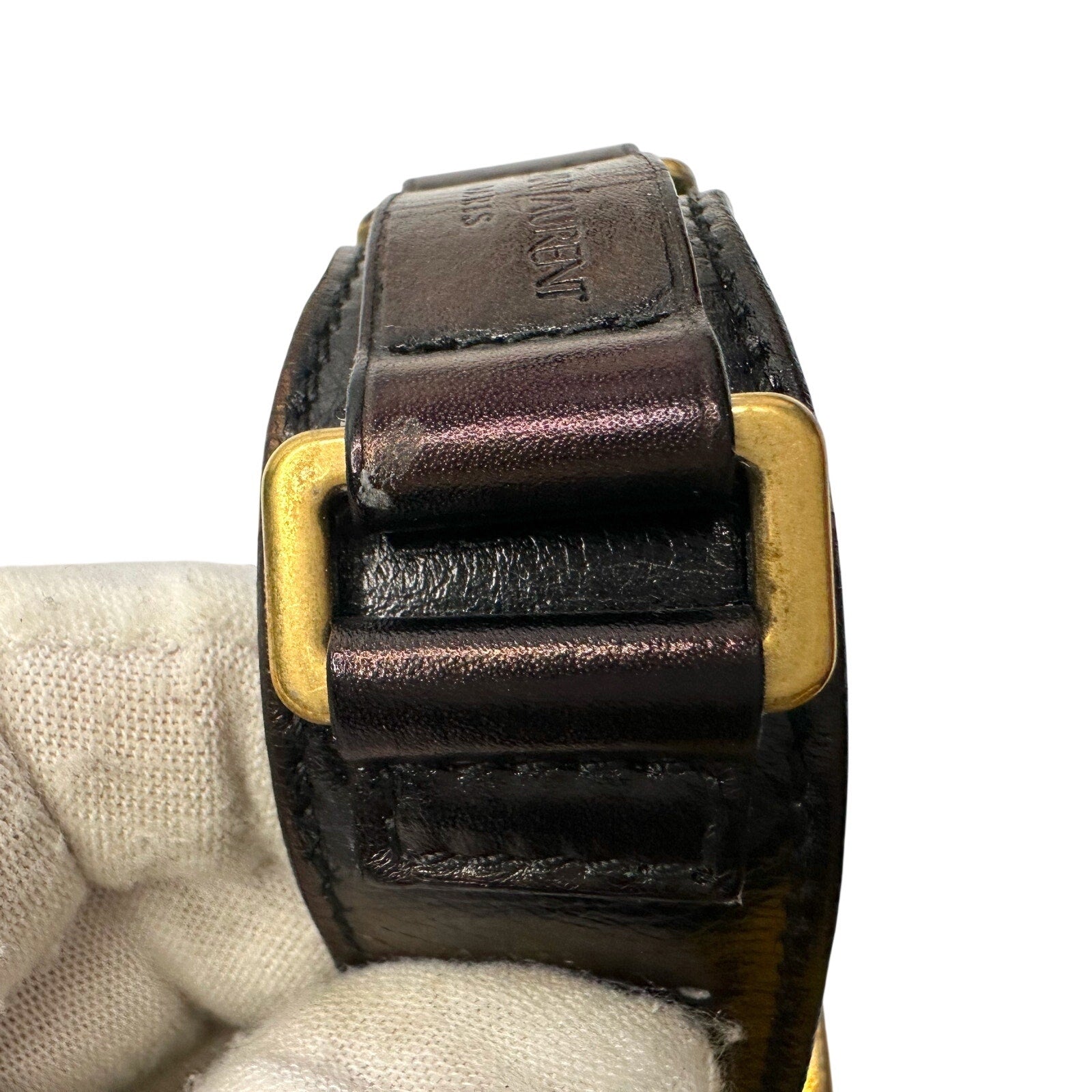 Goldish / Bronzish looking Hardware pops beautifully on dark leather. Yves St. Laurent Paris imprinted on exterior front of bracelt and also inside of band with serial number & made in Italy.